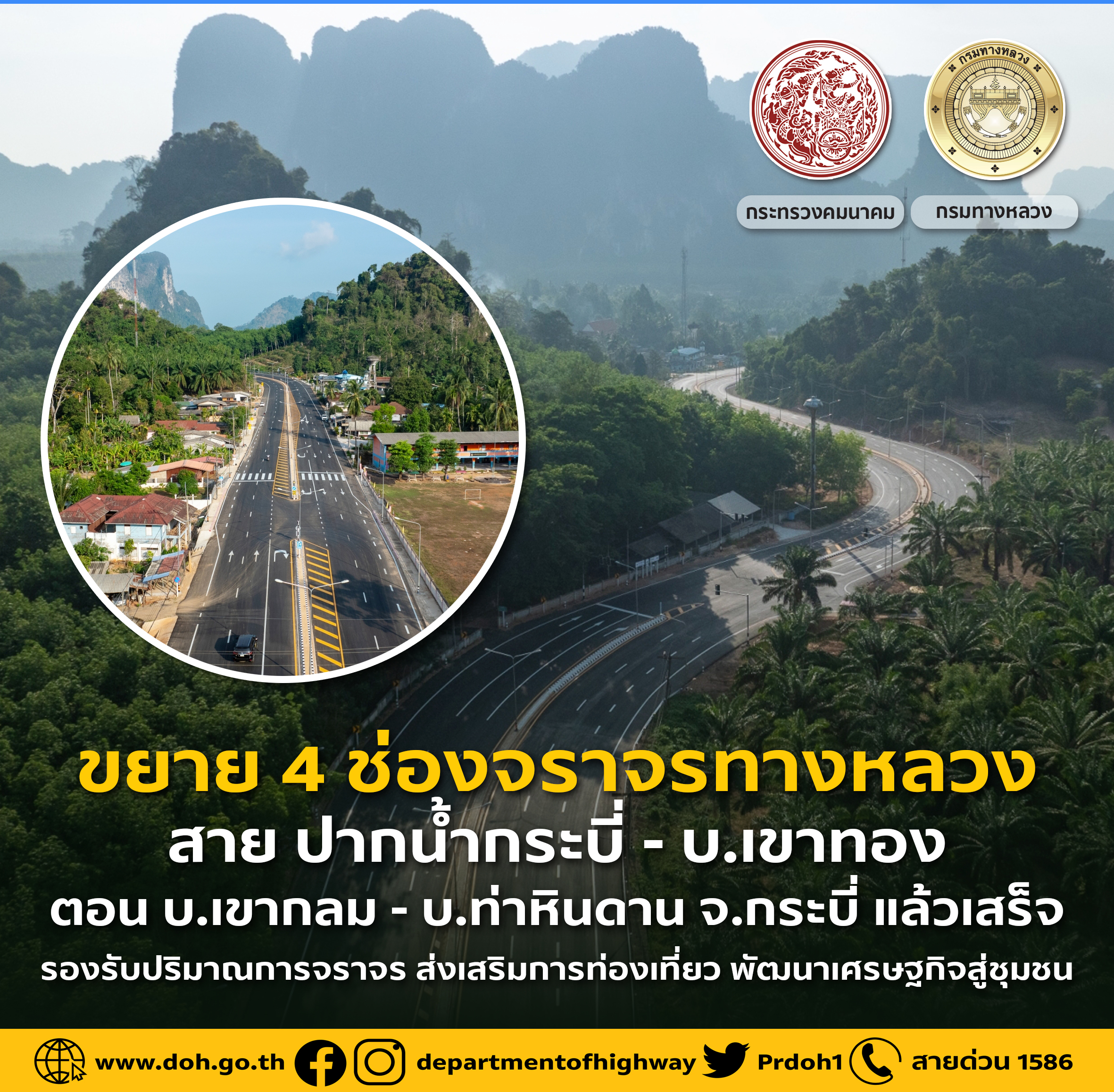 ขยาย 4 ช่องจราจร ทางหลวงสายปากน้ำกระบี่ - บ.เขาทอง ตอน บ.เขากลม - บ.ท่าหินดาน จ.กระบี่ แล้วเสร็จ รองรับปริมาณการจราจร ส่งเสริมการท่องเที่ยว พัฒนาเศรษฐกิจสู่ชุมชน