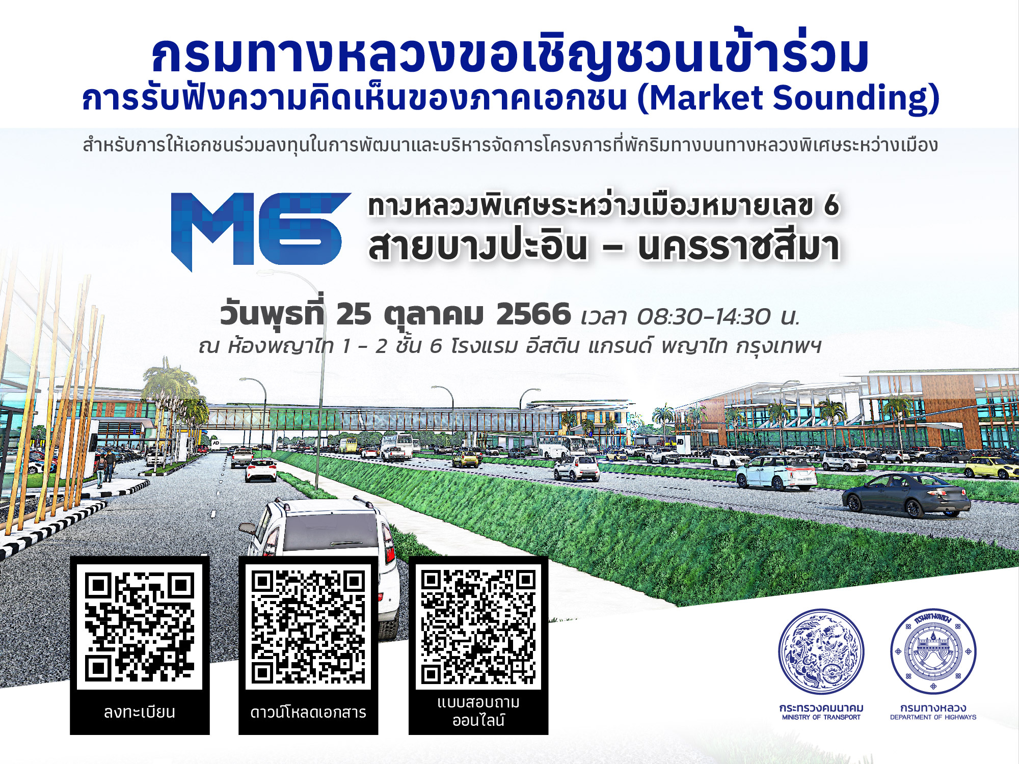 กรมทางหลวงเปิดรับฟังความคิดเห็นภาคเอกชน (Market Sounding) สำหรับการให้เอกชนร่วมลงทุน ในการพัฒนาและบริหารจัดการโครงการที่พักริมทางบนทางหลวงพิเศษระหว่างเมืองหมายเลข 6 สายบางปะอิน-นครราชสีมา