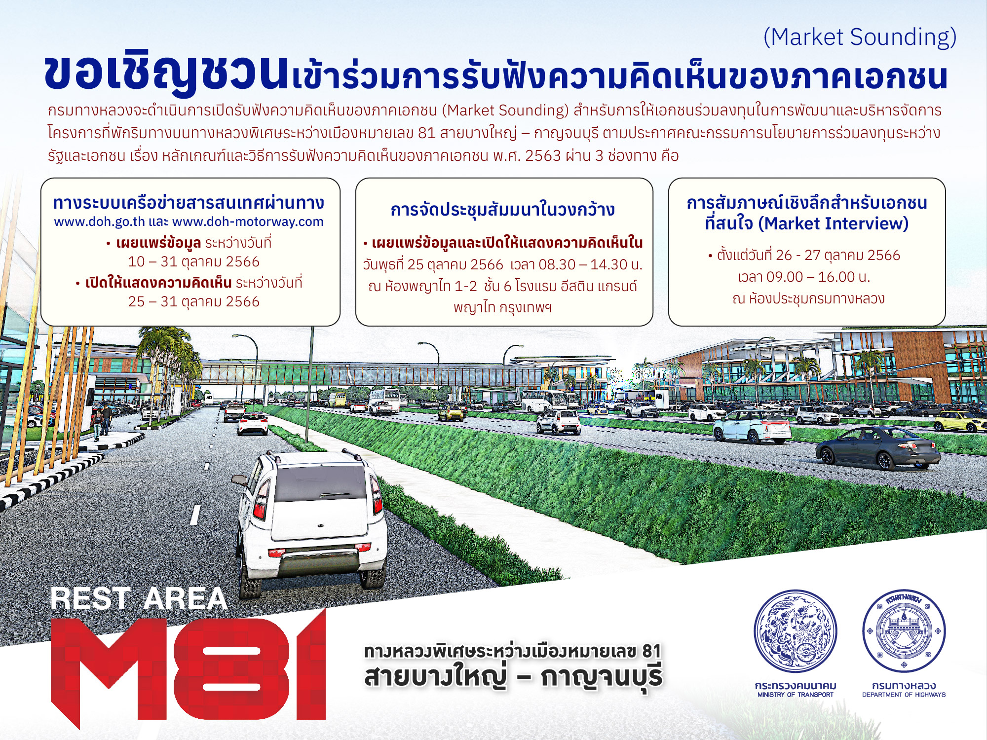 กรมทางหลวงเปิดรับฟังความคิดเห็นภาคเอกชน (Market Sounding) สำหรับการให้เอกชนร่วมลงทุน ในการพัฒนาและบริหารจัดการโครงการที่พักริมทางบนทางหลวงพิเศษระหว่างเมืองหมายเลข 81 สายบางใหญ่-กาญจนบุรี