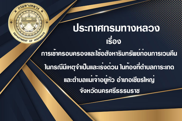 ประกาศกรมทางหลวง เรื่องการเข้าครอบครองและใช้อสังหาริมทรัพย์ก่อนการเวนคืนในกรณีมีเหตุจำเป็นเร่งด่วน ในท้องที่ตำบลการะเกด และตำบลแม่เจ้าอยู่หัว อำเภอเชียรใหญ่ จังหวัดนครศรีธรรมราช
