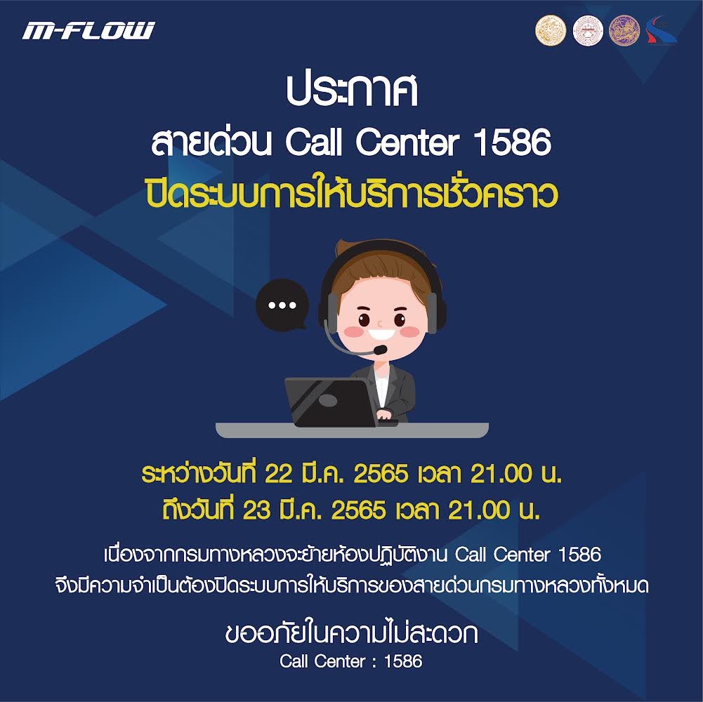สายด่วน Call Center 1586 ปิดระบบการให้บริการชั่วคราว? ระหว่างวันที่ 22 มี.ค. 2565 เวลา 21.00 น. ถึง วันที่ 23 มี.ค. 2565 เวลา 21.00 น.