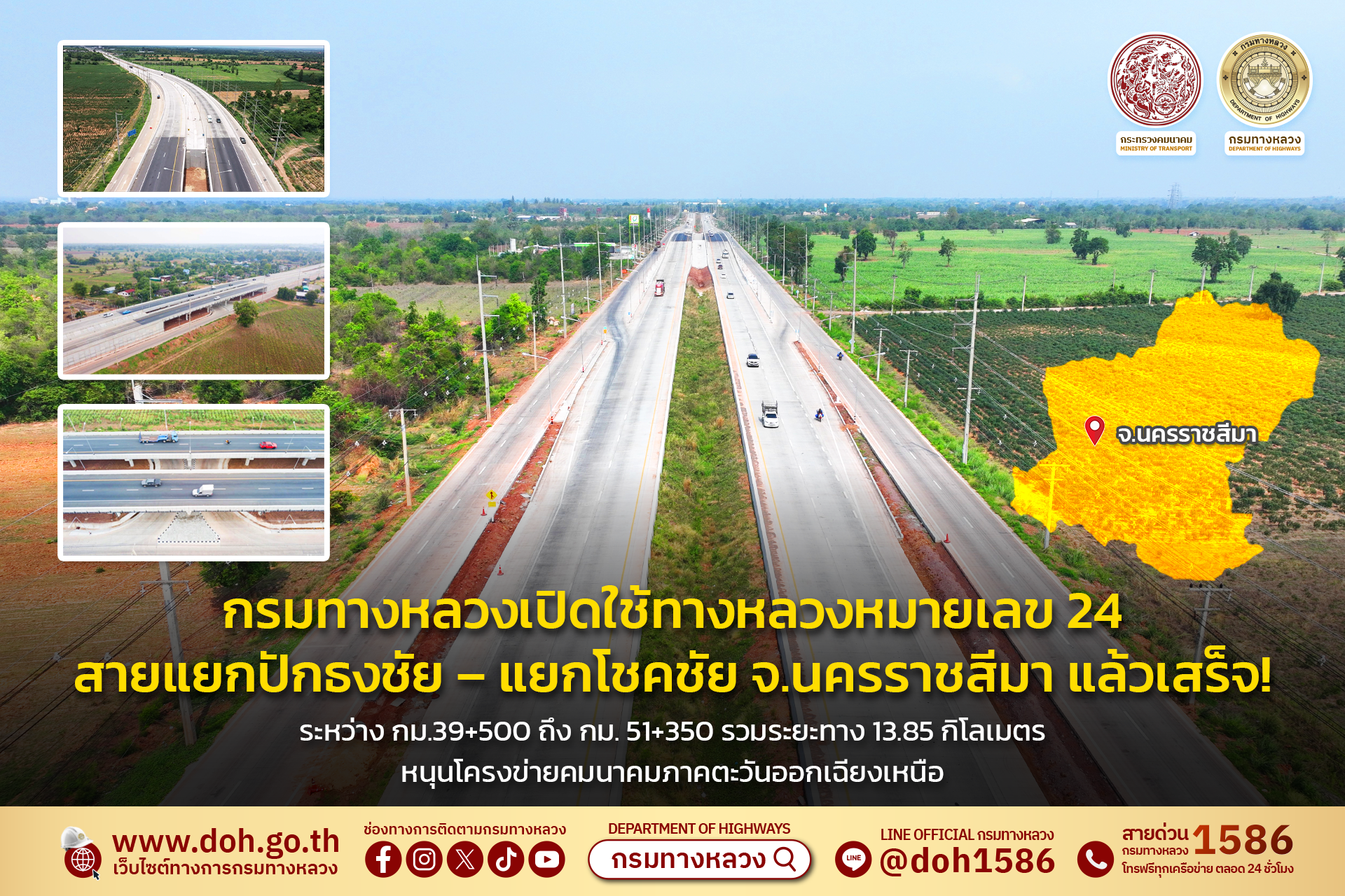 ทล.เปิดใช้ทางหลวงหมายเลข 24 สายแยกปักธงชัย - แยกโชคชัย จ.นครรราชสีมา หนุนโครงข่ายคมนาคมภาคตะวันออกเฉียงเหนือ