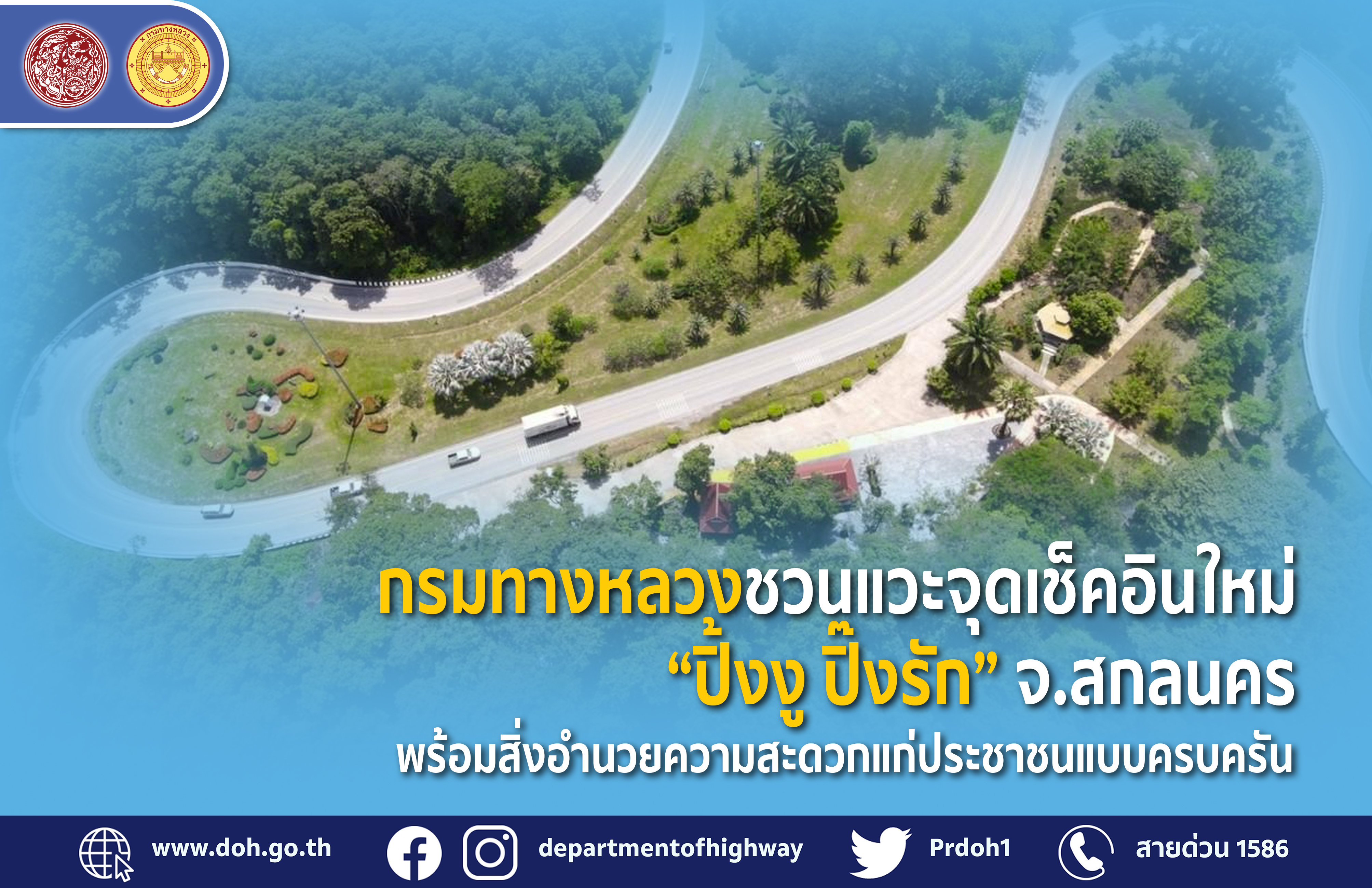 กรมทางหลวงขอความร่วมมือนักท่องเที่ยวเดินทางอย่างปลอดภัยและใส่ใจสิ่งแวดล้อม โปรดขับรถด้วยความระมัดระวัง ปฏิบัติตามป้ายเตือน ป้ายแนะนำ เพื่อความปลอดภัยในการเดินทาง และปฏิบัติตามมาตรฐานสาธารณสุขภายใต้วิถีชีวิตรูปแบบใหม่ “ท่องเที่ยวสุขใจ ห่างไกลโควิด - 19” สวมหน้ากาก ล้างมือ รักษาระยะห่าง ลงทะเบียน ‘ไทยชนะ’ เข้า – ออก หากประชาชนต้องการสอบถามข้อมูลรายละเอียดเพิ่มเติมสามารถติดต่อได้ที่สายด่วนกรมทางหลวง 1586 (โทรฟรีทุกเครือข่ายตลอด 24 ชั่วโมง)