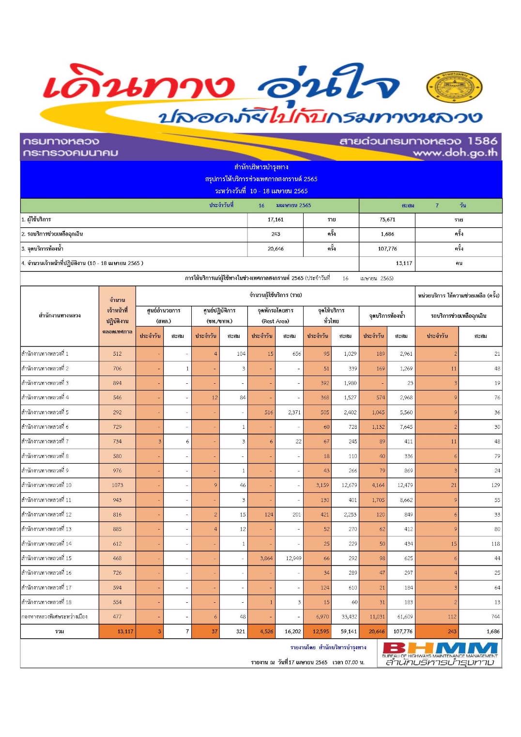 สำหรับจุดให้บริการของกรมทางหลวงในช่วงที่ผ่านมาระหว่างวันที่ 10 – 16 เมษายน 2565 มียอดผู้ใช้บริการสะสมรวม 7 วัน รวม 75,671 ราย รถบริการช่วยเหลือฉุกเฉิน 1,443 ครั้ง และจุดบริการห้องน้ำ 87,130 ครั้ง และยอดการให้บริการสายด่วนกรมทางหลวง 1586 ยอดสะสมตั้งแต่วันที่ 8 - 16 เมษายน 2565 มียอดรวมการให้บริการ 9,841 ครั้ง