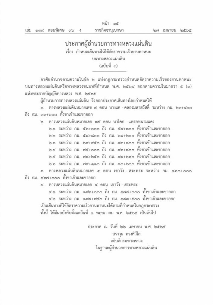ดีเดย์! กรมทางหลวง เพิ่มเส้นทางให้รถวิ่งได้ไม่เกิน 120 กม./ชม. ระยะที่ 3 เพิ่มอีก 3 เส้นทาง เริ่ม 1 พฤษภาคม 2565 นี้
