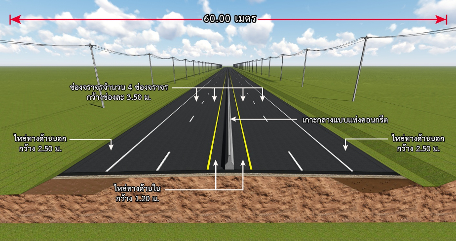 - ออกแบบขนาด 4 ช่องจราจร (ไป - กลับทิศทางละ 2 ช่องจราจร) มีเกาะกลางแบบแท่งแบริเออร์(Median Barrier) ความกว้างช่องละ 3.50 เมตร ไหล่ทางด้านนอกกว้าง 2.50 เมตร ไหล่ทางด้านในกว้าง 1.20 เมตร
