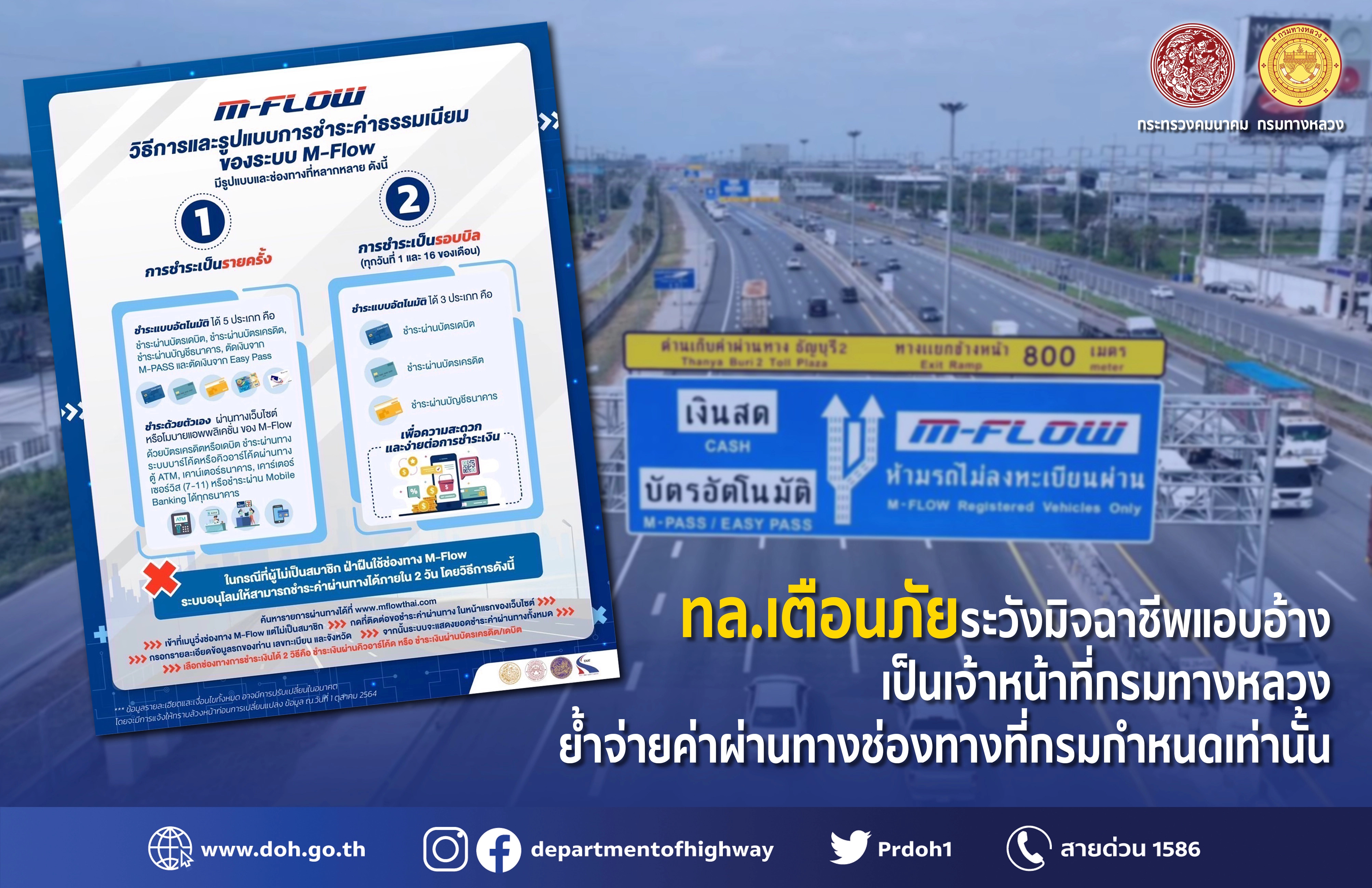 ในกรณีที่เกี่ยวกับการขอโต้แย้งของประชาชน และแจ้งรายละเอียดที่เกี่ยวข้องกับการผ่านทางอัตโนมัติแบบไม่มีไม้กั้น (M-Flow) กรมทางหลวงจะให้เจ้าหน้าที่ติดต่อกลับเท่านั้น จึงขอแจ้งให้ประชาชนโปรดระมัดระวัง ไม่หลงเชื่อคำแอบอ้างดังกล่าว แนะนำให้ชำระผ่านช่องทางที่กรมทางหลวงได้กำหนดไว้ เช่นช่องทางออนไลน์ ซึ่งผู้ใช้บริการสามารถชำระผ่านทางเว็บไซต์หรือโมบายแอพพลิเคชั่น ของ M – Flow ด้วยบัตรเครดิตหรือเดบิต หรือชำระผ่านทางระบบบาร์โค้ดหรือคิวอาร์โค้ดผ่านทางตู้ ATM, เคาน์เตอร์ธนาคาร, เคาน์เตอร์เซอร์วิส (7 – 11) หรือชำระผ่าน Mobile Banking ได้ทุกธนาคารเพื่อความปลอดภัย ลดการแพร่ระบาดการติดเชื้อโควิด – 19  และให้ประชาชนตรวจสอบชื่อบัญชีก่อนทำการชำระโดยชื่อบัญชีจะต้องไม่เป็นชื่อบัญชีส่วนบุคคล