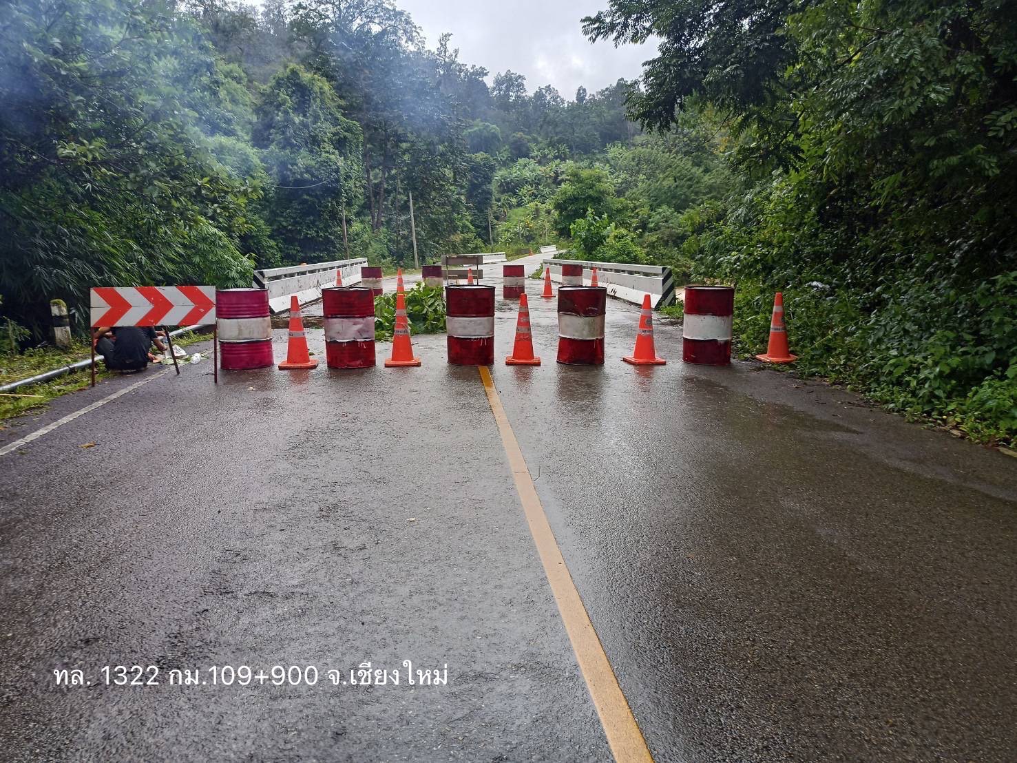 - ทางหลวงหมายเลข 1322 แม่จา – รินหลวง พื้นที่อำเภอเชียงดาว ช่วงกม.ที่ 109+900 เกิดคอสะพานชำรุด เนื่องจากฝนตกหนักติดต่อกันหลายวันทำให้น้ำไหลกัดเซาะริมคันทาง ขณะนี้อยู่ระหว่างการซ่อมแซม และกรมทางหลวงได้จัดเจ้าหน้าที่คอยอำนวยความสะดวก แนะนำเส้นทางเลี่ยงใช้ทางหลวงหมายเลข 1322 กม.0 สามแยกแม่จา