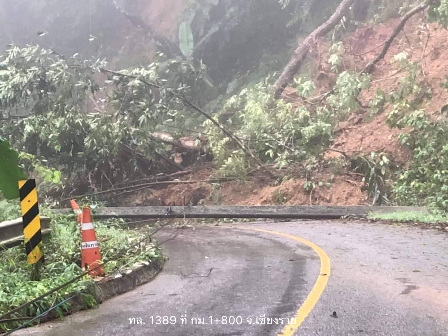 - ทางหลวงหมายเลข 1389 ตอน สถานีเพาะพันธุ์สัตว์ป่าดอยตุง - วัดพระธาตุดอยตุง พื้นที่อำเภอแม่สาย ช่วงกม.ที่ 1+800 ด้านซ้ายทาง ดินสไลด์ปิดทับเส้นทางจราจร 2 ช่องจราจร และเสาไฟฟ้าล้มทับเส้นทางจราจร ปัจจุบันอยู่ระหว่างการเคลื่อนย้ายวัสดุ และกรมทางหลวงได้จัดเจ้าหน้าที่คอยอำนวยความสะดวก แนะนำเส้นทางเลี่ยง ใช้ทางหลวงหมายเลข 1149