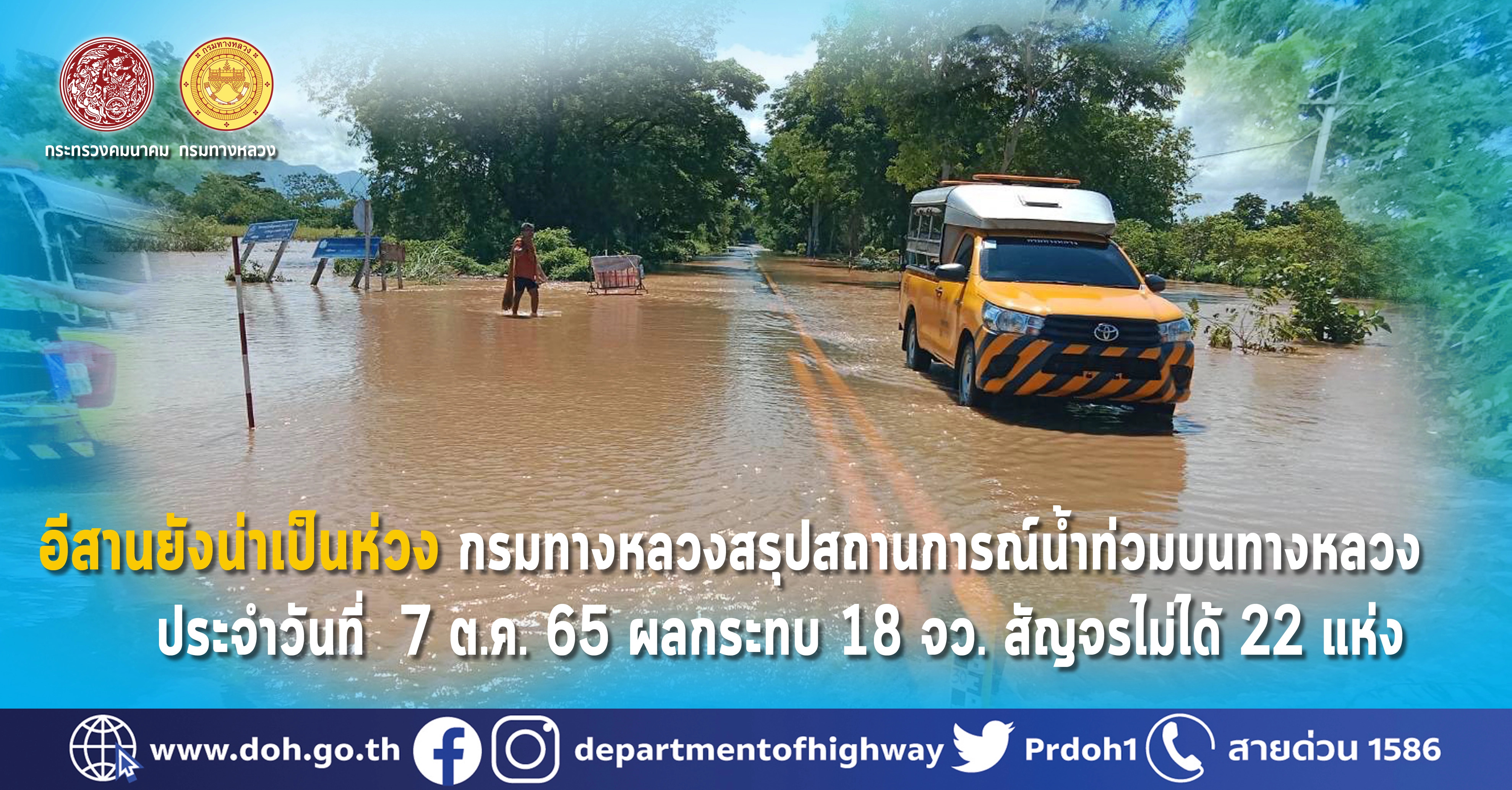 กรมทางหลวงร่วมบูรณาการกับหน่วยงานที่เกี่ยวข้องในการลงพื้นที่ เพื่อช่วยเหลือประชาชน พร้อมเร่งระบายน้ำบำรุงรักษาเส้นทางที่ได้รับผลกระทบพร้อมติดตั้งป้ายเตือนและอุปกรณ์อำนวยความปลอดภัยแก่ผู้ใช้เส้นทาง ในขณะที่บางพื้นที่ก็มีการล้างทำความสะอาดถนน ทางลอดใต้สะพานหลังจากน้ำลดลงบ้างแล้ว เพื่อบรรเทาความเดือดร้อนของประชาชนให้ได้รับความสะดวกปลอดภัยในการสัญจรโดยเร็วที่สุดอย่างต่อเนื่อง 24 ชั่วโมง ตามข้อสั่งการของ นายศักดิ์สยาม ชิดชอบ รัฐมนตรีว่าการกระทรวงคมนาคม ที่มีความห่วงใย จากสถานการณ์ฝนตกหนักในหลายพื้นที่ พร้อมทั้งเฝ้าระวังตลอด 24 ชั่วโมง เพื่อช่วยประชาชนอย่างทันท่วงที พร้อมกันนี้กรมทางหลวง ได้ทำการสรุปสถานการณ์อุทกภัยและดินสไลด์บนทางหลวง โดยสถานการณ์ประจำวันที่ 7 ตุลาคม 2565 เวลา 12.30 น. พบทางหลวงถูกน้ำท่วม/ดินสไลด์ในพื้นที่ 18 จังหวัด ได้แก่ จ.เลย, จ.ศรีสะเกษ, จ.สุรินทร์, จ.บุรีรัมย์, จ.นครราชสีมา, จ.ขอนแก่น, จ.มหาสารคาม, จ.ชัยภูมิ, จ.อุบลราชธานี, จ.ร้อยเอ็ด, จ.ลพบุรี, จ.สุพรรณบุรี, จ.อ่างทอง, จ.พระนครศรีอยุธยา, จ.สิงห์บุรี, จ.ปราจีนบุรี, จ.เพชรบูรณ์ และ จ.ประจวบคีรีขันธ์ จำนวน 48 สายทาง จำนวน 65 แห่ง ทางหลวงที่การจราจรผ่านได้ 43 แห่ง การจราจรผ่านไม่ได้ 22 แห่ง ในพื้นที่ 8 จังหวัด โดยทุกจุดมีเจ้าหน้าที่คอยอำนวยความสะดวกด้านการจราจร รายละเอียดดังนี้
