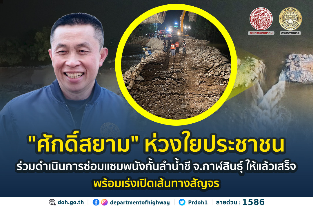 นายสราวุธ ทรงศิวิไล อธิบดีกรมทางหลวง เปิดเผยถึงความคืบหน้าการดำเนินการซ่อมแซมพนังกั้นลำน้ำชี บริเวณบ้านสะดำศรี ต.ลำชี อ.ฆ้องชัย จ.กาฬสินธุ์ ที่ถูกกระแสน้ำกัดเซาะจนขาดเป็นแนวยาวกว่า 50 เมตร ทั้ง 2 ฝั่ง เหตุเกิดตั้งแต่คืนวันที่ 16 ตุลาคมที่ผ่านมา โดยกรมทางหลวงร่วมดำเนินการซ่อมแซมพนังกั้นลำน้ำชีอย่างเร่งด่วน และคาดว่าจะแล้วเสร็จภายในคืนของวันที่ 24 ตุลาคม 2565 นี้
