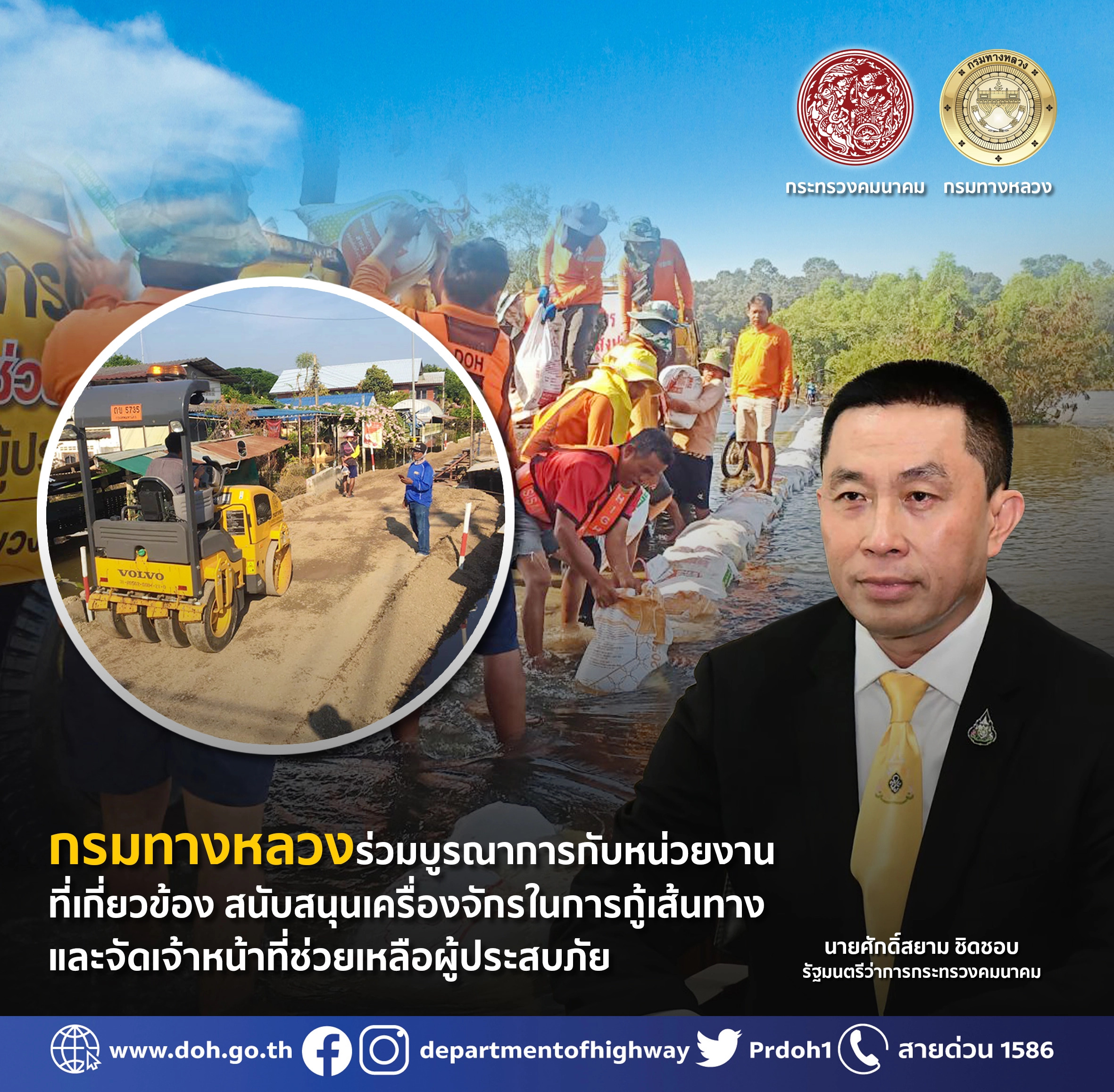 นายสราวุธ  ทรงศิวิไล อธิบดีกรมทางหลวง เปิดเผยว่า จากสถานการณ์น้ำท่วมบนทางหลวงในขณะนี้นั้น โดยเฉพาะภาคตะวันออกเฉียงเหนือและภาคกลางในขณะนี้นั้น ได้สั่งการให้หน่วยงานในพื้นที่เร่งดำเนินการภารกิจกู้เส้นทางในจังหวัดที่ได้รับผลกระทบอย่างต่อเนื่อง ระดมกำลังเจ้าหน้าที่ กั้นน้ำโดยการวางกระสอบทราย พร้อมทำการติดตั้งป้ายเตือนแนวทาง และบูรณาการให้ความช่วยเหลือร่วมกับหน่วยงานที่เกี่ยวข้อง เพื่อบรรเทาความเดือดร้อนของประชาชนให้ได้รับความสะดวกปลอดภัยในการสัญจรโดยเร็วที่สุด พร้อมทั้งเฝ้าระวังตลอด 24 ชั่วโมง ตามข้อสั่งการของ นายศักดิ์สยาม ชิดชอบ รัฐมนตรีว่าการกระทรวงคมนาคม ที่มีความห่วงใยประชาชนผู้ประสบภัยในครั้งนี้ โดยได้ดำเนินการ ดังนี้
