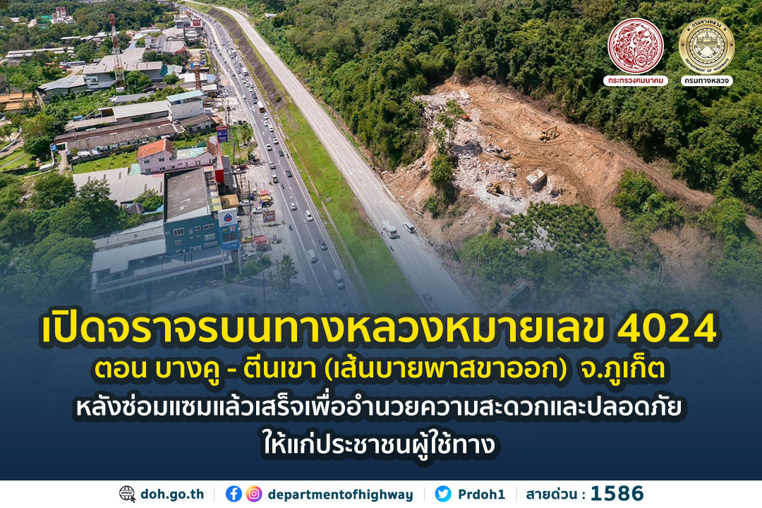 กรมทางหลวง โดย สำนักทางหลวงที่ 17(กระบี่) แขวงทางหลวงภูเก็ต ร่วมกับหน่วยงานที่เกี่ยวข้องทั้งภาครัฐและเอกชน ร่วมกันบูรณาการดำเนินงานและประเมินสถานการณ์ด้านความปลอดภัยบนทางหลวงหมายเลข 4024 กม.ที่ 3+500 - กม.ที่ 3+550 ด้านขวาทาง หลังจากเจ้าของอาคารได้ดำเนินการรื้อถอนอาคารร้าง ตั้งแต่วันที่ 28 ตุลาคม 2565 ที่ผ่านมาเรียบร้อยแล้ว และมีผู้เชี่ยวชาญด้านวิศวกรรมจากหน่วยงานที่เกี่ยวข้องเข้าพื้นที่เพื่อประเมินความปลอดภัยและคืนผิวจราจรให้ผู้ใช้ทางสัญจรได้ตามปกติ ต่อมาแขวงทางหลวงภูเก็ตนำเครื่องจักรพร้อมเจ้าหน้าที่ดำเนินการเก็บกวาดดินและหินบนผิวจราจร ร่วมกับเทศบาลตำบลรัษฎาดำเนินการล้างทำความสะอาดถนนเรียบร้อยแล้วเสร็จ สามารถเปิดการได้ตั้งแต่เวลา 12.30 น.