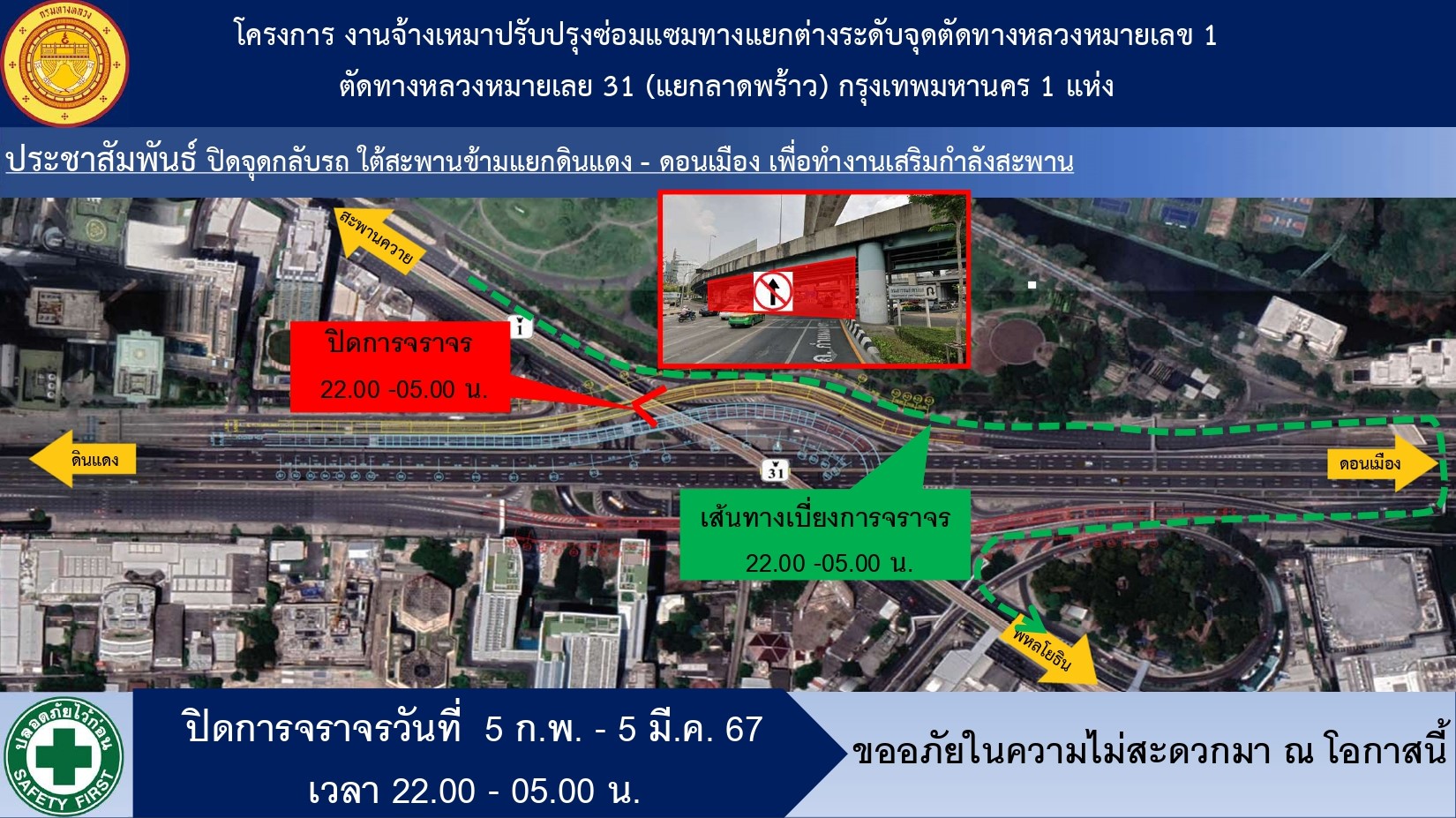 ปิดถนนใต้สะพานข้ามเเยกดินแดง - ดอนเมือง/พหลโยธิน (สะพานควายมุ่งหน้ารัชโยธินและพหลโยธินไปดอนเมือง) เพื่อดำเนินการเสริมกำลังสะพาน (Strengthening) ตั้งแต่เวลา 22:00 - 05:00 น. ระหว่างวันที่ 5 กุมภาพันธ์ - 5 มีนาคม 2567