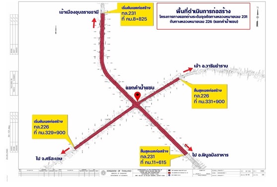 นายสุริยะ กล่าวว่า กระทรวงคมนาคม โดยกรมทางหลวง ได้มีแผนดำเนินโครงการก่องสร้าง “แยกต่างระดับคำน้ำแซบ” ซึ่งเป็นทางแยกจุดตัด ทล.231 กับ ทล.226 แยกคำน้ำแซบ เพื่อแก้ไขปัญหาด้านการจราจรจากความหนาแน่น และปริมาณจราจรที่เพิ่มขึ้น ช่วยลดอุบัติเหตุทางถนนและเพื่อเพิ่มศักยภาพของพื้นที่จังหวัดอุบลราชธานี ในการรองรับการขยายตัวของอุตสาหกรรมและการท่องเที่ยว โดยที่ตั้งโครงการฯ อยู่กลางแยกคำน้ำแซบ พื้นที่ศึกษาโครงการในระยะ 500 เมตร จากกึ่งกลางแนวเส้นทางโครงการ ซึ่งครอบคลุม 2 ตำบล ได้แก่ ตำบลคำน้ำแซบ และตำบลโนนผึ้ง กำหนดรูปแบบทางแยกต่างระดับ เป็นอุโมงค์ขนาด 2 ช่องจราจร ต่อทิศทางบน ทล.231 ลอด ทล.226 และบริเวณแยกที่ระดับพื้นที่ ควบคุมด้วยระบบสัญญาณไฟจราจร นอกจากนี้ยังมีสะพานยกระดับความกว้างรวม 2 ช่องจราจร สวนเลนบน ทล.226 การออกแบบรูปแบบนี้ เพื่อเน้นรองรับปริมาณจราจรบน ทล.231 เป็นหลัก เพราะมีปริมาณจราจรสูงที่สุด แลเ ทล.226 ซึ่งมีปริมาณจราจรรองลงมาเป็นอันดับสอง ให้มีความคล่องตัวมากยิ่งขึ้นในทิศทางตรง