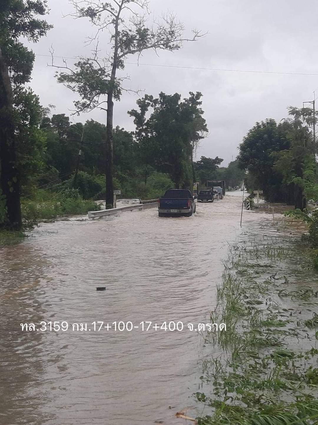 3. ทางหลวงหมายเลข 3158 แสนตุ้ง - หนองบัว ช่วง กม.29+600 – 30+400 ในพื้นที่อำเภอเขาสมิง จังหวัดตราด ระดับน้ำสูง 50 ซม. ทำให้การจราจรผ่านไม่ได้ แนะนำให้ใช้ทางหลวงท้องถิ่นเป็นทางเลี่ยง