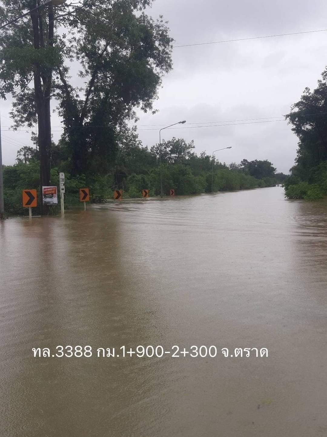 4. ทางหลวงหมายเลข 3388 บ้านโป่ง - บ่อไร่ ช่วง กม.1+900 – 2+300 ในพื้นที่อำเภอเขาสมิง จังหวัดตราด ระดับน้ำสูง 120 ซม. ทำให้การจราจรผ่านไม่ได้ แนะนำให้ใช้ทางหลวงท้องถิ่นเป็นทางเลี่ยง