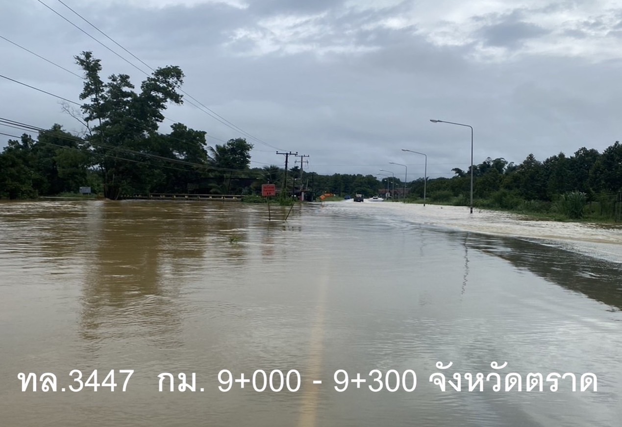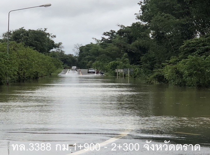 กรมทางหลวง อัปเดตเส้นทางน้ำท่วมพื้นที่ จ.ตราด ผ่านไม่ได้ 1 แห่ง คือ ทล.3388 สายบ้านโป่ง - บ่อไร่ อ.บ่อสมิง จ.ตราด พร้อมจัดเจ้าหน้าที่ช่วยเหลือประชาชน 24 ชม.