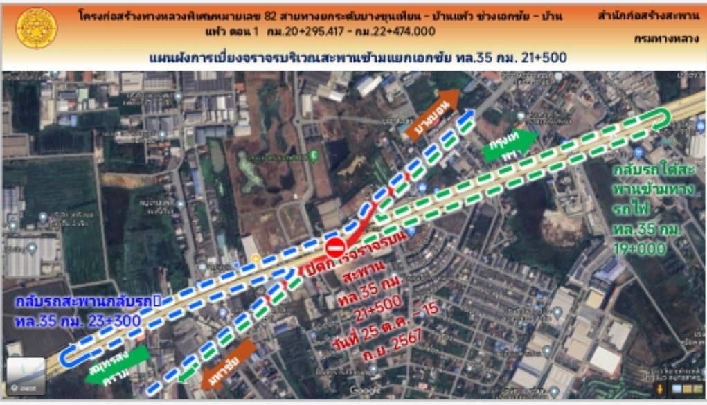 กรมทางหลวง แจ้งปิดการจราจรสะพานต่างระดับเอกชัย พื้นที่ อ.เมือง จ.สมุทรสาคร บนทางหลวงหมายเลข 35 (ถนนพระรามที่ 2) เนื่องจาก โครงการก่อสร้างทางหลวงหมายเลข 82 (M82 ) จะดำเนินการติดตั้งชิ้นส่วนพื้นสะพาน (segment) ที่ กม.21+496.417 หรือ บริเวณสะพานมหาชัยเมืองใหม่