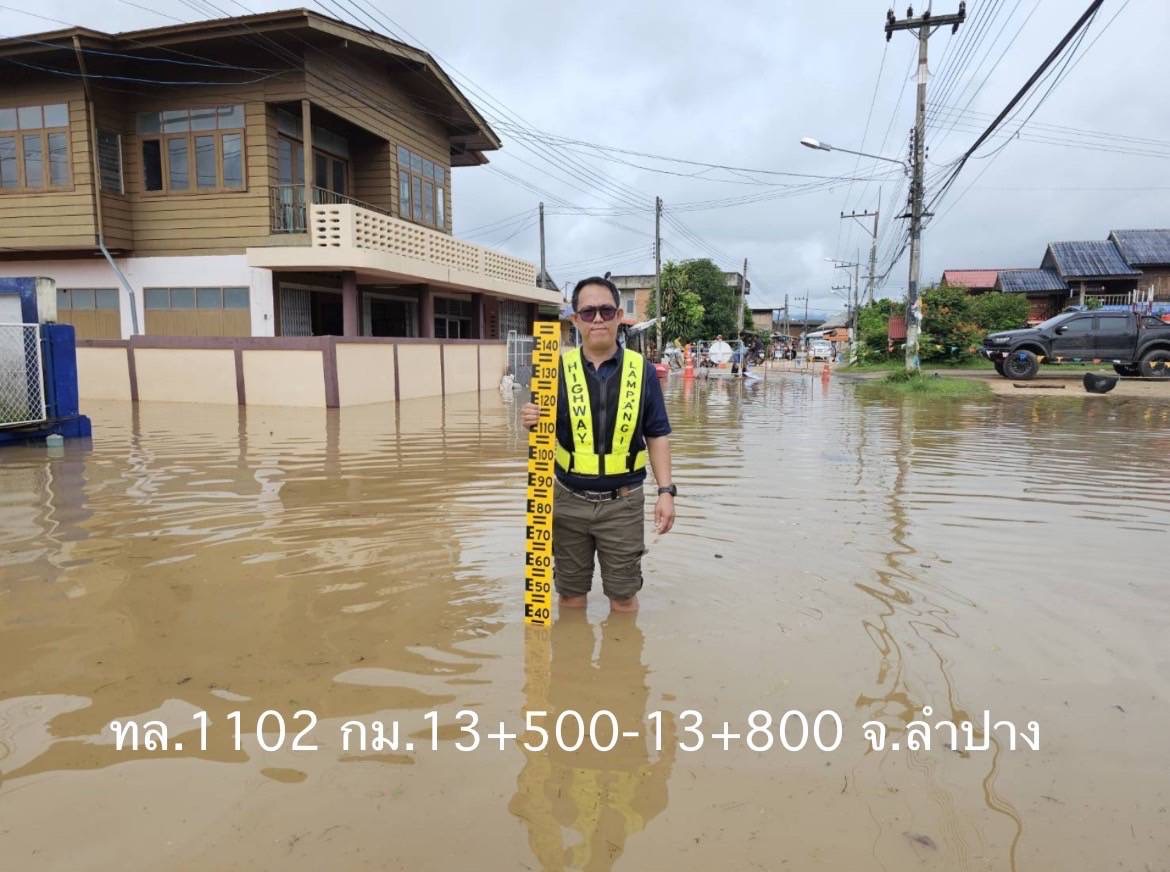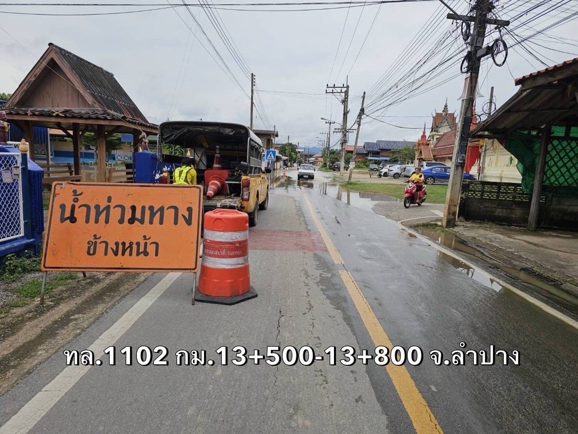 1. ทางหลวงหมายเลข 1102 อ.แม่พริก สายพระบาท - บ้านเหล่า กม.ที่ 13+500 – 13+800 ระดับน้ำ 40 ซม. การจราจรผ่านไม่ได้ ไม่มีเส้นทางเลี่ยง