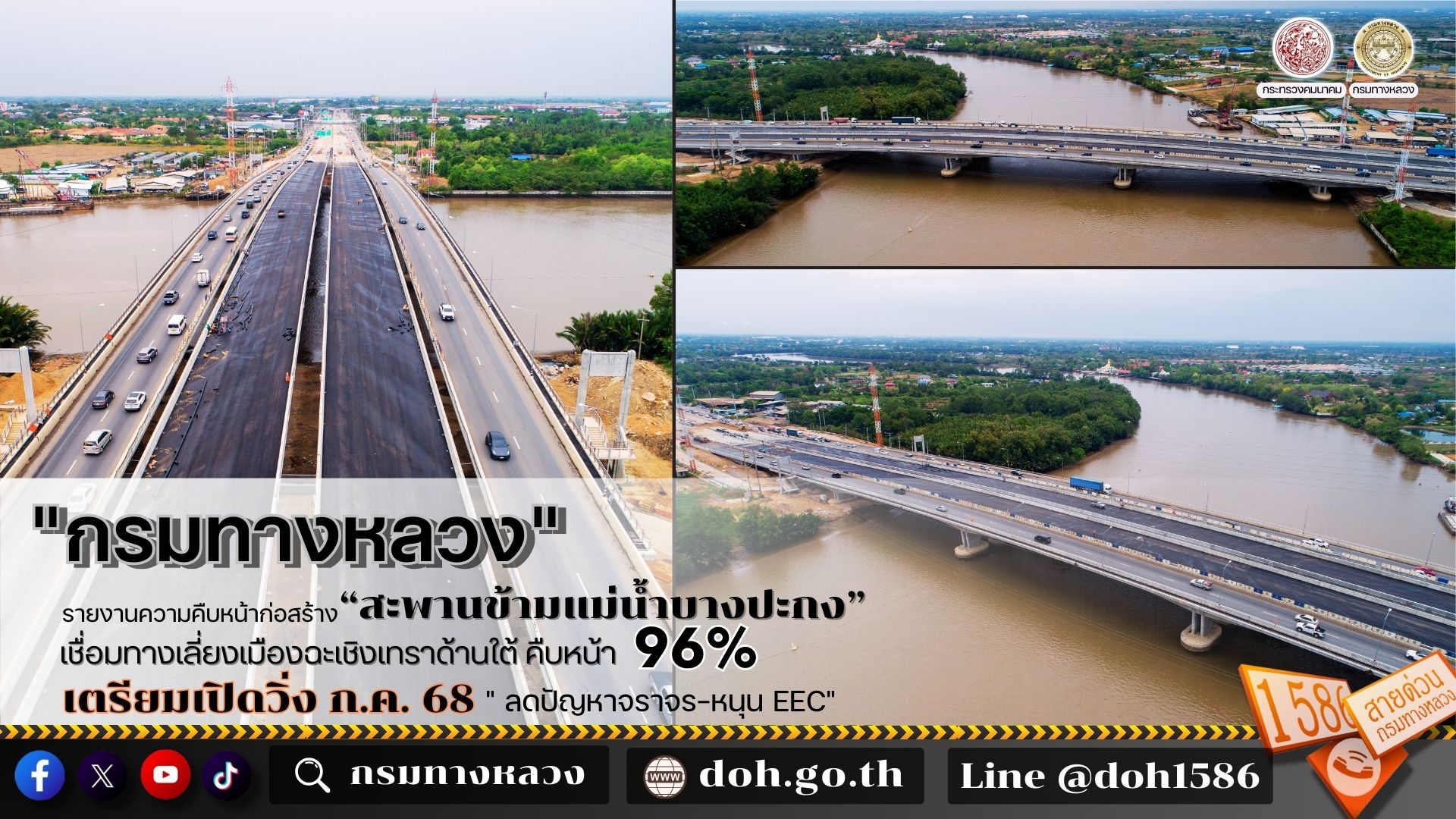 นายอภิรัฐ ไชยวงศ์น้อย อธิบดีกรมทางหลวง เปิดเผยว่า โครงการก่อสร้างสายทางเลี่ยงเมืองฉะเชิงเทราด้านใต้ (สะพานข้ามแม่น้ำบางปะกง) พื้นที่ อ.เมือง จ.ฉะเชิงเทรา นับเป็นโครงการที่มีความสำคัญอย่างยิ่งต่อการพัฒนาโครงข่ายคมนาคมในพื้นที่จังหวัดฉะเชิงเทราและภาคตะวันออก ปัจจุบันสภาพการจราจรบนทางหลวงหมายเลข 365 สายทางเลี่ยงเมืองฉะเชิงเทรา มีปริมาณ 80,000 คันต่อวัน เป็นรถบรรทุก 30% เดิมมีขนาด 4 ช่องจราจร (ไป - กลับ) ต่อมากรมทางหลวงได้ทำการก่อสร้างขยายทางหลวงเป็นขนาด 10 ช่องจราจร (ไป - กลับ) แต่สะพานข้ามแม่น้ำบางปะกงยังมีแค่ 4 ช่องจราจร ส่งผลให้เกิดจุดคอขวดที่บริเวณทางขึ้นลงสะพาน การจราจรติดขัดอย่างมาก โดยเฉพาะในช่วงเวลาเร่งด่วน รถติดสะสมเป็นทางยาว ทำให้ผู้ใช้ทางต้องเสียเวลาในการเดินทางมากขึ้นหลายเท่าตัว ประชาชนไม่ได้รับความสะดวกในการเดินทางและการขนส่งสินค้า เพิ่มต้นทุนโลจิสติกส์ และเพิ่มมลพิษทางอากาศ ซึ่งส่งผลเสียต่อสุขภาพของประชาชนที่อาศัยอยู่ในพื้นที่ ด้วยความสำคัญนี้ กรมทางหลวง โดยสำนักก่อสร้างสะพาน จึงได้ดำเนินการโครงการฯ เพื่อแก้ไขปัญหาจราจรติดขัดในตัวเมือง เชื่อมโยงโครงข่ายทางหลวงสายสำคัญ พร้อมทั้งสนับสนุนการเดินทางและการขนส่งสินค้าให้มีความคล่องตัวมากยิ่งขึ้น ซึ่งจะช่วยเสริมศักยภาพด้านโลจิสติกส์ของประเทศ ลดระยะเวลาเดินทางในตัวเมืองฉะเชิงเทราและจังหวัดใกล้เคียง ยกระดับคุณภาพชีวิต สนับสนุนการค้าการลงทุนใน EEC โดยมีลักษณะ การก่อสร้างงานโยธาดังนี้