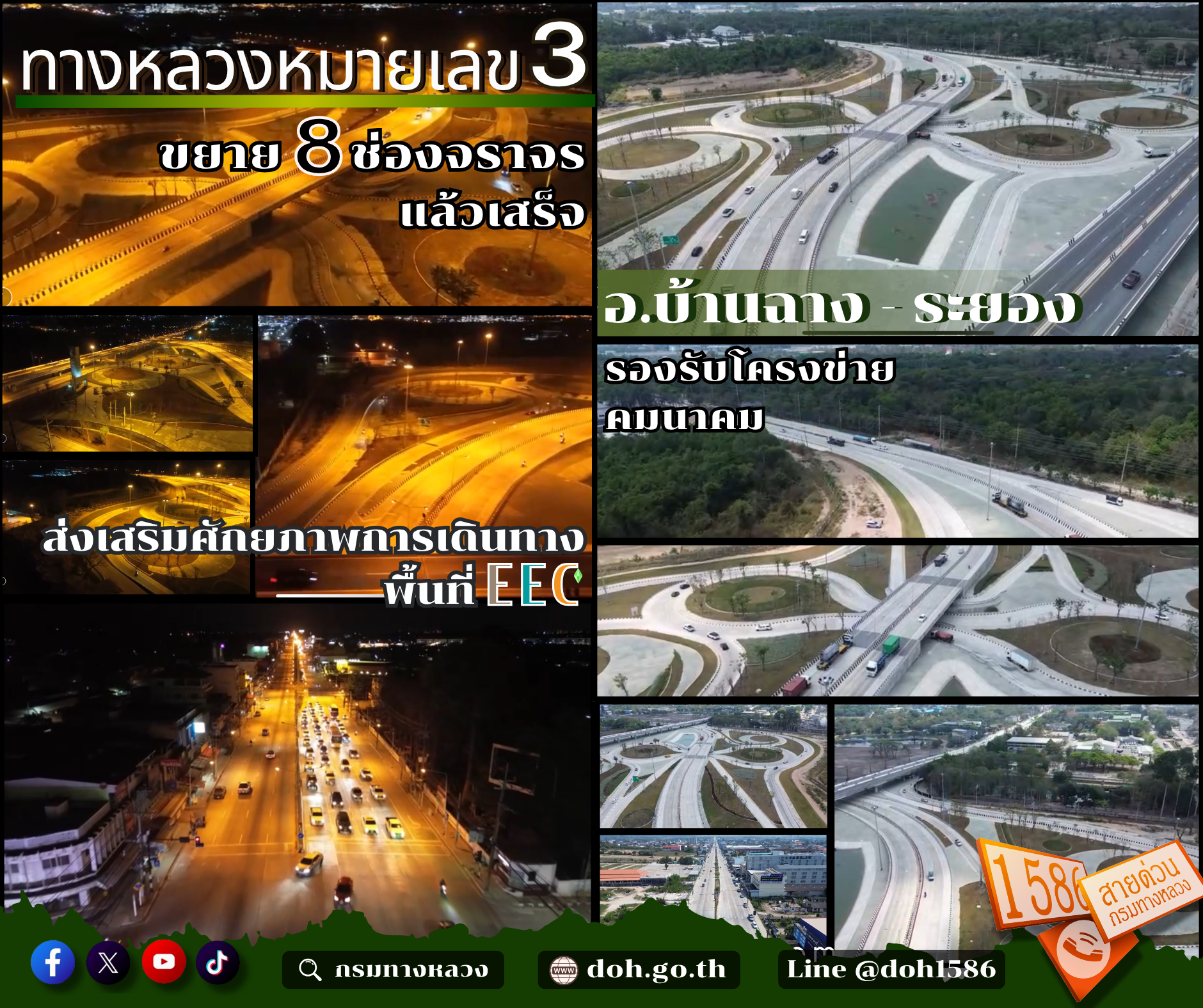 กรมทางหลวงก่อสร้างขยายทางหลวงหมายเลข 3 ช่วง อ.บ้านฉาง - ระยอง ตอนที่ 1 แล้วเสร็จ พัฒนาเศรษฐกิจ ภาคตะวันออก ส่งเสริมโลจิสติกส์ในพื้นที่ EEC (โครงการเขตพัฒนาพิเศษภาคตะวันออก)