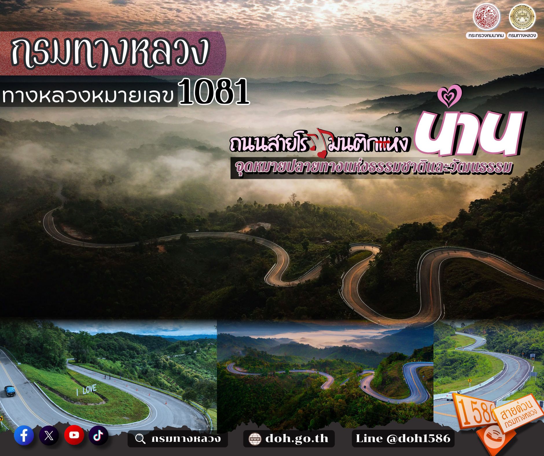 กรมทางหลวง (ทล.) พาเที่ยวจังหวัดน่านที่ถือเป็นหนึ่งในจุดหมายปลายทางยอดนิยมของนักท่องเที่ยว ผู้หลงใหลในธรรมชาติ ความเงียบสงบ และวัฒนธรรมท้องถิ่น โดยเฉพาะ "ทางหลวงหมายเลข 1081" เส้นทาง สายปัว - สันติสุข – บ่อเกลือ – เฉลิมพระเกียรติ ซึ่งได้รับการยกย่องให้เป็นหนึ่งในเส้นทางถนนที่สวยที่สุดในประเทศไทย ที่นักเดินทางไม่ควรพลาด
