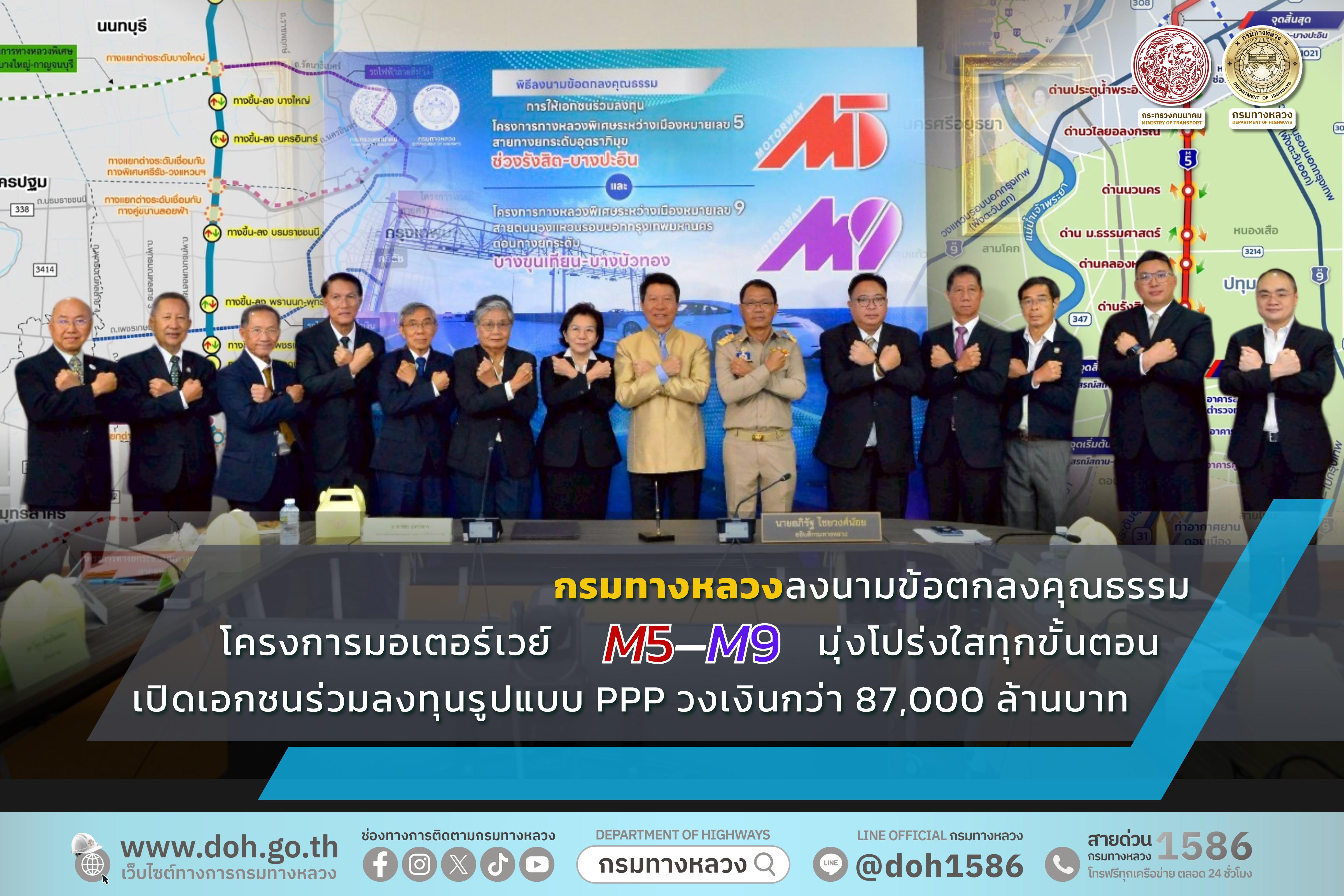 วันนี้ (11 มิถุนายน 2568) นายอภิรัฐ ไชยวงศ์น้อย อธิบดีกรมทางหลวง ได้ลงนามข้อตกลงคุณธรรม (Integrity Pact) สำหรับโครงการทางหลวงพิเศษระหว่างเมืองหมายเลข 5 (M5) ช่วงรังสิต – บางปะอิน และโครงการทางหลวงพิเศษระหว่างเมืองหมายเลข 9 (M9) ช่วงบางขุนเทียน – บางบัวทอง ร่วมกับผู้สังเกตการณ์ตามข้อตกลงคุณธรรมจากองค์กรต่อต้านคอร์รัปชัน (ประเทศไทย) หรือ ACT โดยมีผู้บริหารจากกรมทางหลวง, ACT และหน่วยงานที่เกี่ยวข้องร่วมเป็นสักขีพยาน เพื่อแสดงเจตจำนงในการดำเนินโครงการอย่างสุจริต โปร่งใส และตรวจสอบได้ในทุกขั้นตอน
