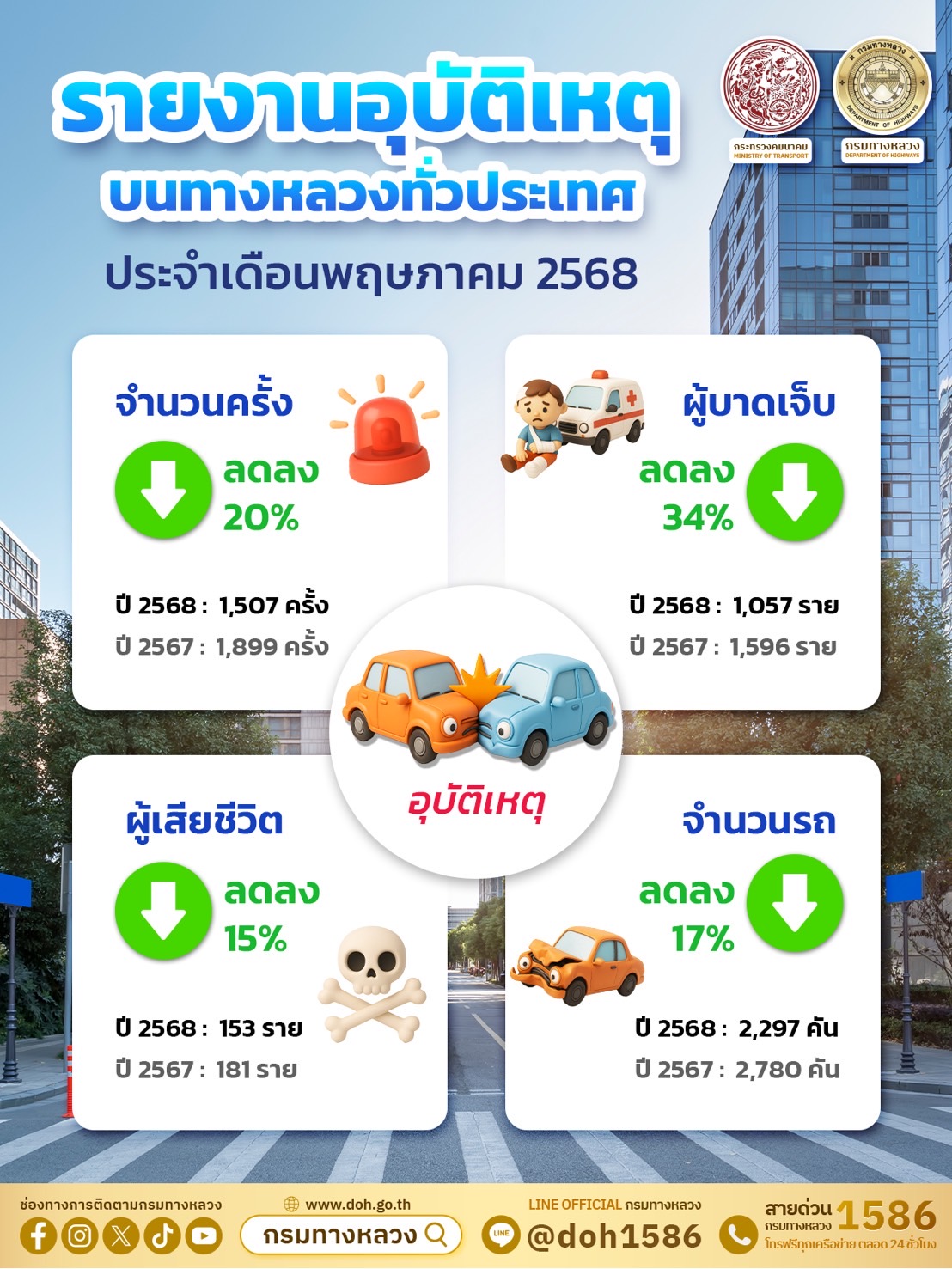 กรมทางหลวง โดยสำนักอำนวยความปลอดภัย ได้สรุปรายงานข้อมูลอุบัติเหตุบนทางหลวงทั่วประเทศประจำเดือนพฤษภาคม 2568 จากการรายงานอุบัติเหตุทางระบบ HAIMS พบว่า อุบัติเหตุเกิดขึ้นบนทางหลวงในความรับผิดชอบของกรมทางหลวง จำนวน 1,507 ครั้ง ทำให้มีผู้เสียชีวิต 153 คน ได้รับบาดเจ็บทั้งสิ้น 1,057 คน จำนวนรถที่เกิดอุบัติเหตุ 2,297 คัน เป็นเหตุให้ทรัพย์สินของกรมทางหลวงเสียหายประมาณ 16 ล้านบาท เมื่อเปรียบเทียบสถิติอุบัติเหตุประจำเดือนพฤษภาคม 2567 จำนวนอุบัติเหตุลดลงจากปีที่ผ่านมา 20% ผู้เสียชีวิตลดลง 15% บาดเจ็บลดลง 34% จำนวนรถที่เกิดอุบัติเหตุลดลง 17% ซึ่งสาเหตุหลักการเกิดอุบัติเหตุมาจากผู้ขับขี่ขับรถด้วยความเร็วสูงกว่ากฎหมายกำหนด 67% (1,012 ครั้ง) รองลงมาได้แก่ หลับใน 9% (143 ครั้ง) และการตัดหน้าระยะกระชั้นชิด 6% (97 ครั้ง)