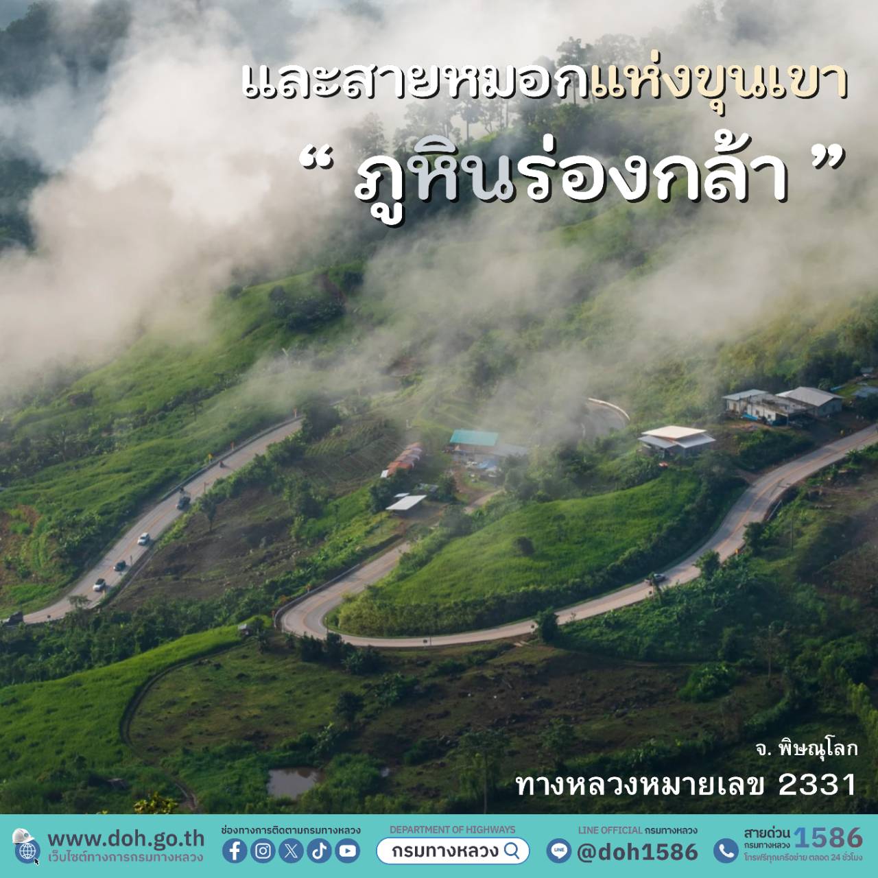 กรมทางหลวงชวนท่องเที่ยวช่วงปลายฝนต้นหนาว ชมทะเลหมอก “อุทยานแห่งชาติภูหินร่องกล้า” จังหวัดเพชรบูรณ์เป็นอีกจุดหมายที่ไม่ควรพลาด ด้วยอากาศที่เย็นสบายพร้อมความงามของทะเลหมอกยามเช้าที่ปกคลุมไปทั่วหุบเขาสวยงามราวภาพวาด