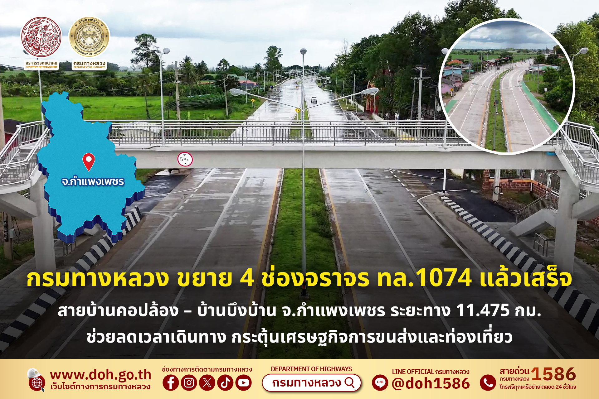 กรมทางหลวง เดินหน้าพัฒนาโครงข่ายคมนาคมอย่างต่อเนื่อง ล่าสุด โครงการก่อสร้างขยายทางหลวงหมายเลข 1074 สายบ้านคอปล้อง – บ้านบึงบ้าน ในพื้นที่อำเภอบึงสามัคคี จังหวัดกำแพงเพชร ระยะทาง 11.475 กิโลเมตร จากขนาด 2 ช่องจราจรเป็นขนาด 4 ช่องจราจร ได้ดำเนินการก่อสร้างแล้วเสร็จ พร้อมเปิดให้ประชาชนใช้สัญจรอย่างเป็นทางการแล้ว เพื่อเพิ่มศักยภาพการเดินทางและขนส่ง รองรับการขยายตัวทางเศรษฐกิจและการท่องเที่ยวระหว่างจังหวัดกำแพงเพชรและจังหวัดพิจิตร