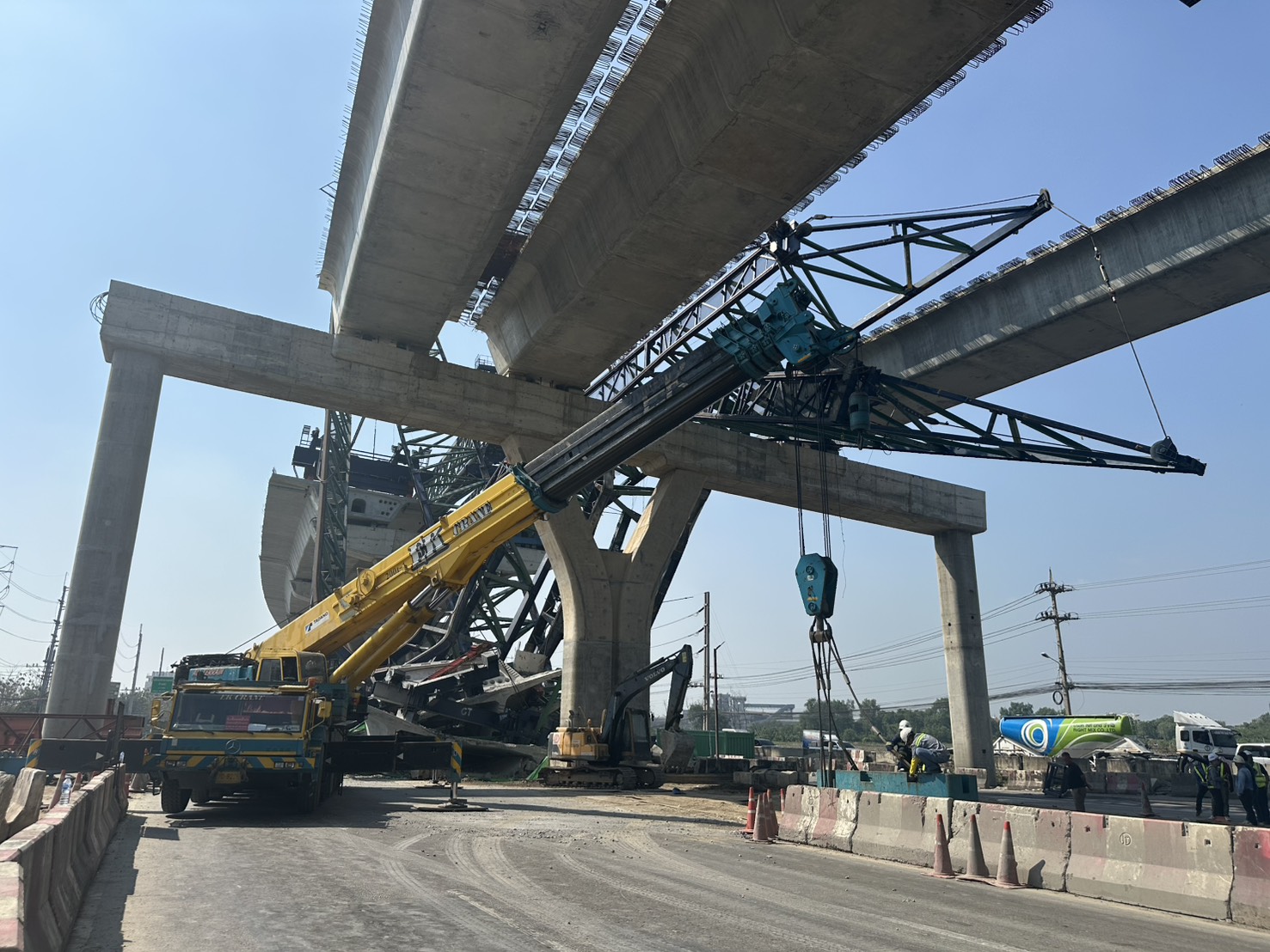 ขณะเดียวกันได้ระดมเครนขนาด 550 ตัน จำนวน 2 คัน พร้อมเครื่องจักรเข้าพื้นที่ เพื่อเร่งยกโครงเหล็กติดตั้งสะพานที่มีน้ำหนักมากออกจากรถยนต์ที่ได้รับความเสียหาย เพื่อให้เจ้าหน้าที่กู้ภัยสามารถเข้าดำเนินการเคลื่อนย้ายร่างผู้เสียชีวิตที่ติดอยู่ภายในรถออกจากที่เกิดเหตุให้ได้เร็วที่สุด พร้อมทั้งสั่งหยุดงานก่อสร้างในโครงการนี้ทันที เพื่อตรวจสอบสาเหตุและป้องกันไม่ให้เกิดอุบัติเหตุซ้ำรอย