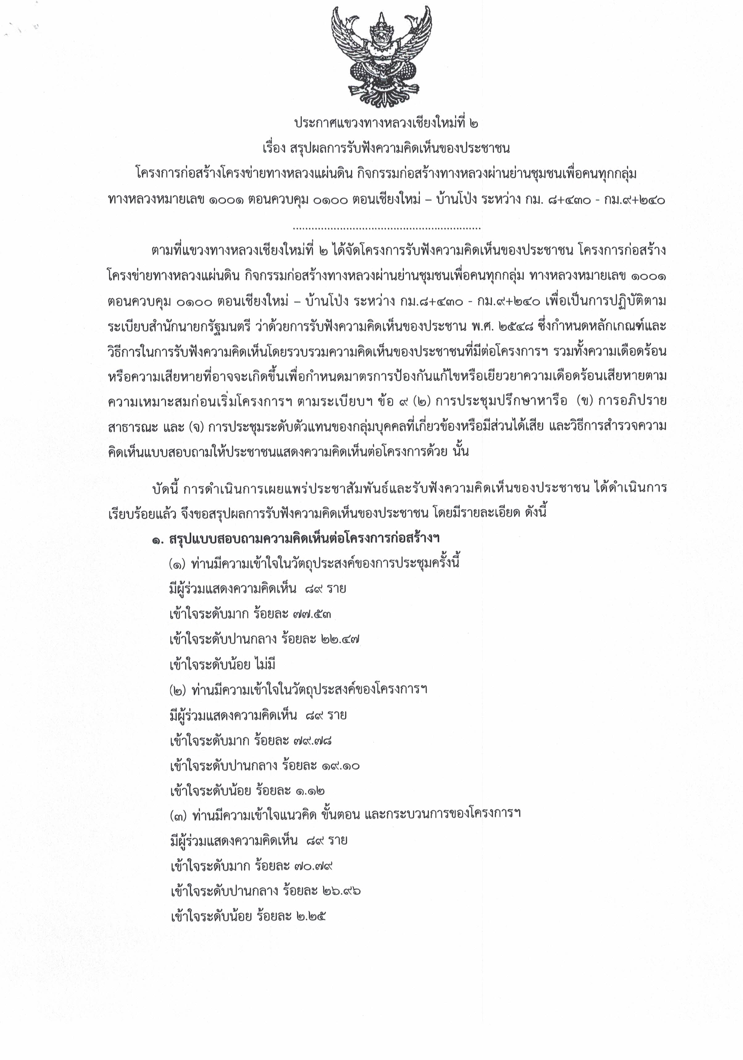 ประกาศแขวงทางหลวงเชียงใหม่ที่ ๒ เรื่อง สรุปผลการรับฟังความคิดเห็นของประชาชน โครงการก่อสร้าง โครงข่ายทางหลวงแผ่นดิน งานก่อสร้างทางผ่านชุมชนเพื่อคนทุกกลุ่ม ทางหลวงหมายเลข ๑๐๐๑ ตอนควบคุม ๐๑๐๐ ตอน เชียงใหม่ – บ้านโป่ง ระหว่าง กม.๘+๔๓๐ – กม.๙+๒๔๐