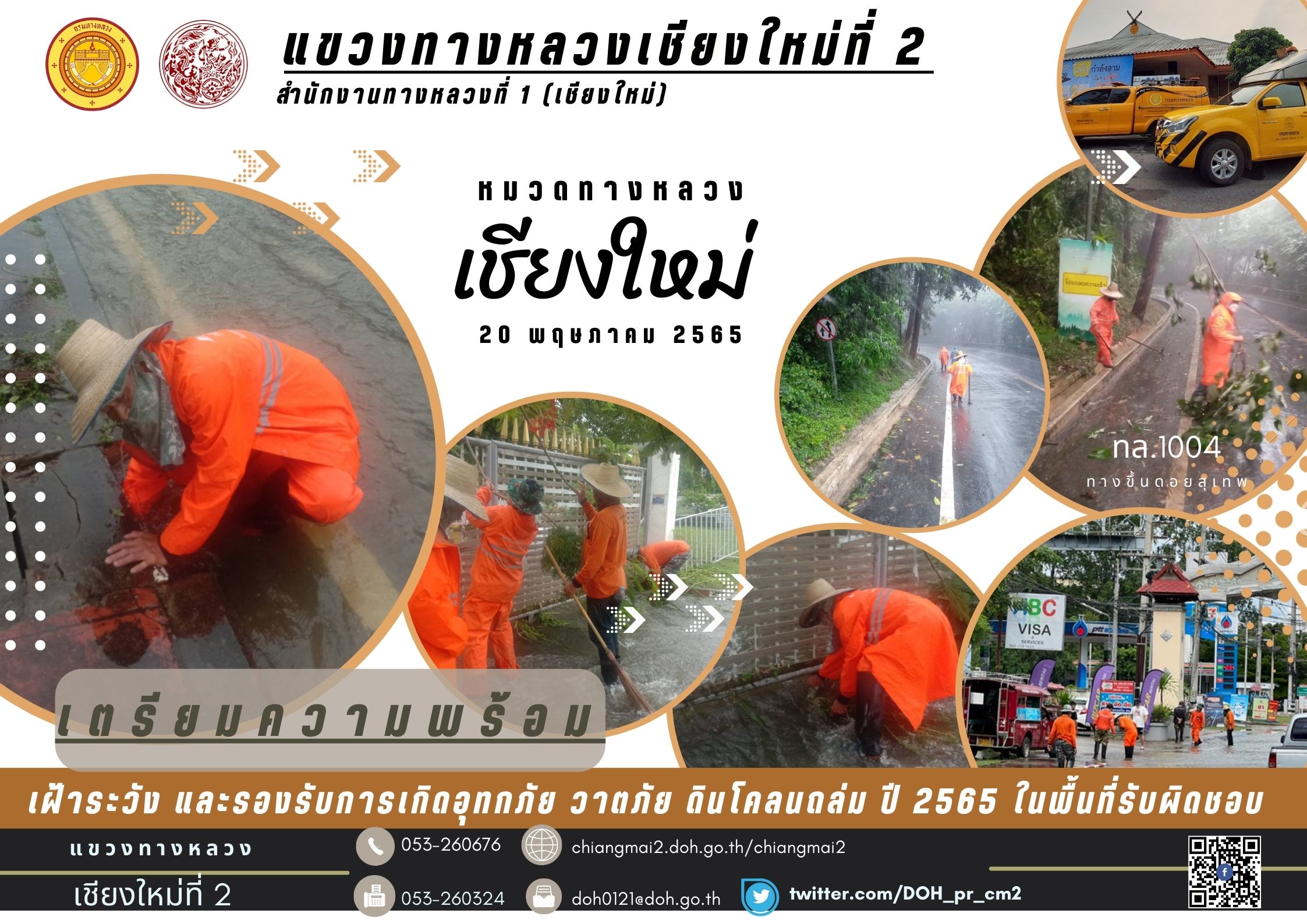 นายนิคม เทพบุตร ผู้อำนวยการแขวงทางหลวงเชียงใหม่ที่ 2 สั่งการทุกหน่วยงานในสังกัด เตรียมความพร้อม เฝ้าระวัง และรองรับการเกิดอุทกภัย วาตภัย ดินโคลนถล่ม ปี 2565 โดยให้เจ้าหน้าที่ในสังกัดลงพื้นที่เฝ้าระวังดูแลเส้นทางรับผิดชอบ ตลอดจนดูแลเก็บเศษใบไม้ และขยะอุดตัน ตามตะแกรงระบายน้ำ ฝาท่อระบายน้ำ เพื่ออำนวยความสะดวกแก่ผู้ใช้รถใช้ถนนในการเดินทางสัญจร
