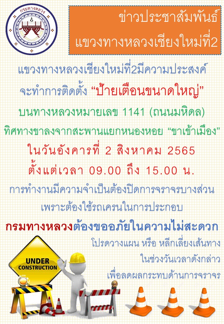 วันที่ 2 สิงหาคม 2565 เวลา 09.00 -15.00 น.ทล.1141 (ถนนมหิดล)ทิศทางขาลงจากสะพานแยกหนองหอย "ขาเข้าเมือง"