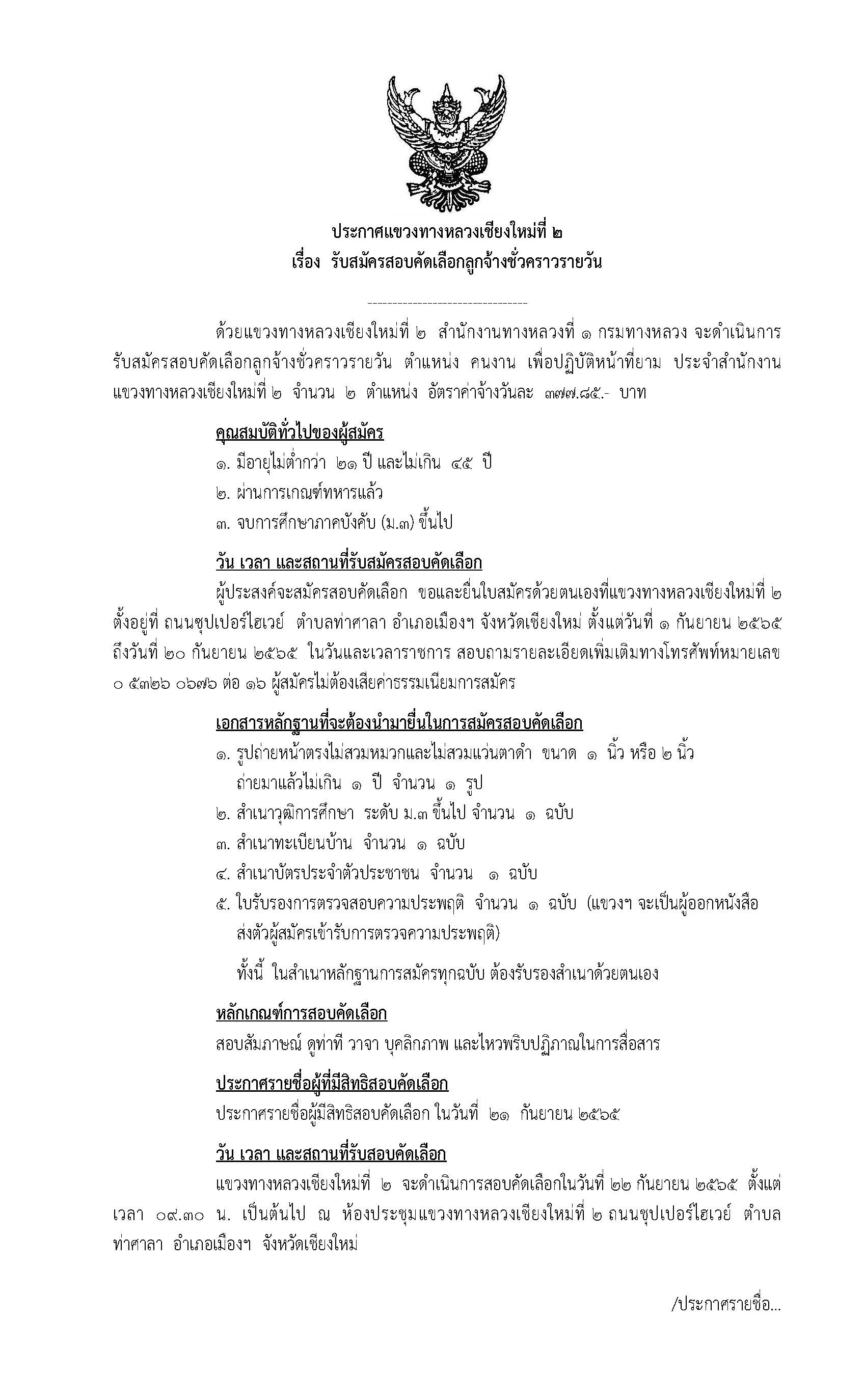 แขวงทางหลวงเชียงใหม่ที่ 2 เปิดรับสมัครสอบคัดเลือกลูกจ้างชั่วคราวรายวัน