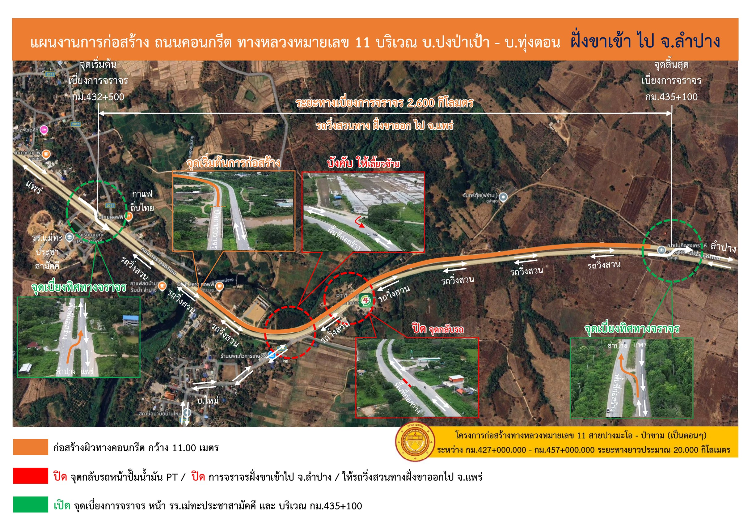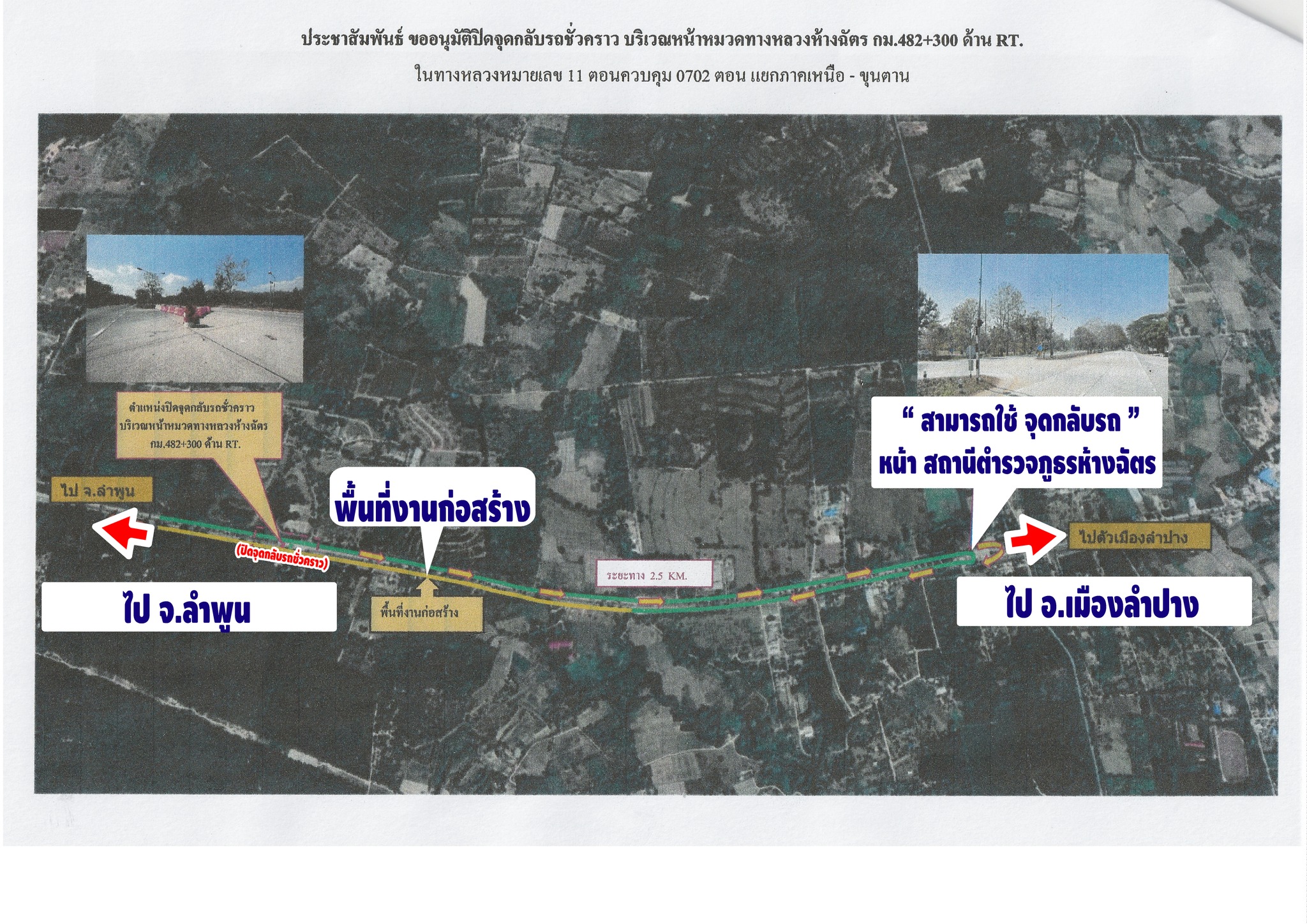 (ปิดจุดกลับรถชั่วคราว) บริเวณฯ หน้าหมวดทางหลวงห้างฉัตร กม.๔๘๒+๓๐๐ (ด้าน RT. ขวาทาง)