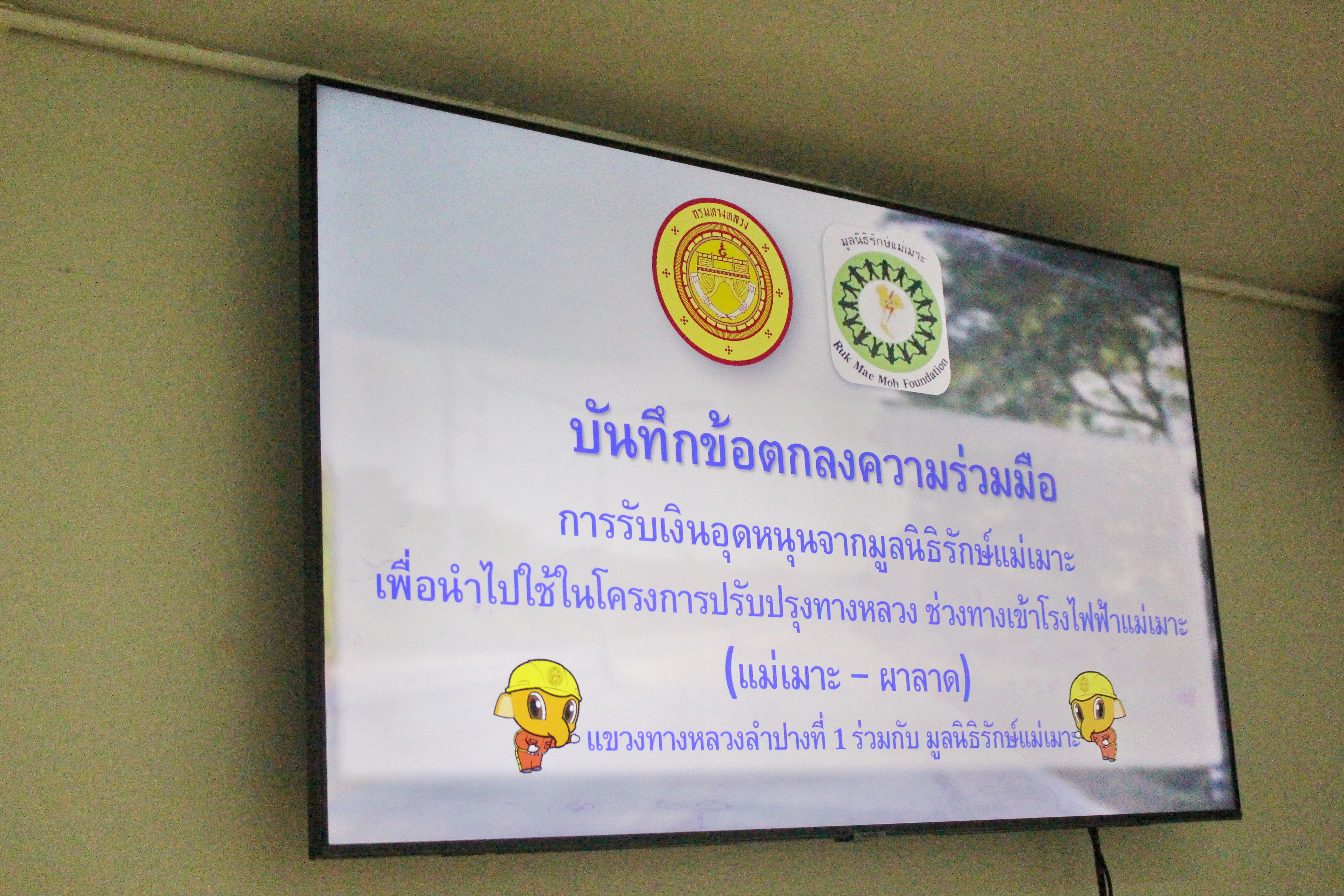 บันทึกข้อตกลงความร่วมมือการรับเงินอุดหนุนจากมูลนิธิรักษ์แม่เมาะ เพื่อนำไปใช้ในโครงการปรับปรุงทางหลวง ช่วงทางเข้าโรงไฟฟ้าแม่แมาะ