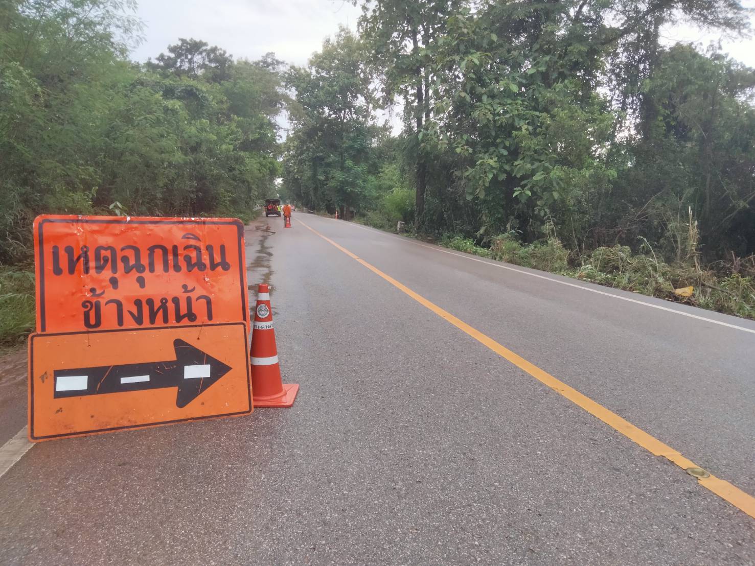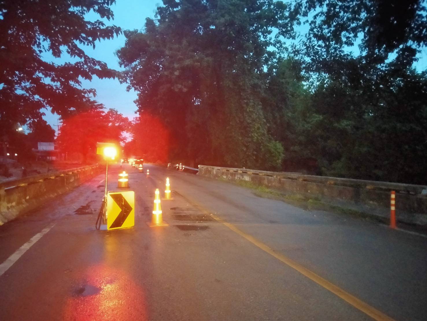 ได้ดำเนินการติดตั้งป้ายเตือน ถังยาง กรวยยาง และสัญญานไฟกระพริบ บริเวณคอสะพานจุดที่ผิวจราจรได้รับความเสียหาย จากกรณีน้ำท่วมทาง