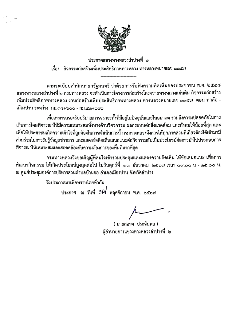 13 01/04/2567 ประกาศแขวงทางหลวงลำปางที่ 2 เรื่องการประชุมการมีส่วนร่วมของประชาชนแผนการดำเนินงานการมีส่วนร่วมของประชาชน กิจกรรมก่อสร้างเพิ่มประสิทธิภาพทางหลวง งานก่อสร้างเพิ่มประสิทธิภาพทางหลวง ทางหลวงหมายเลข 1157 ตอนควบคุม 0100 ตอน ท่าล้อ - เมืองปาน ระหว่าง กม.๓๖+๐๐๐ - กม.๓๘+๔๒๕