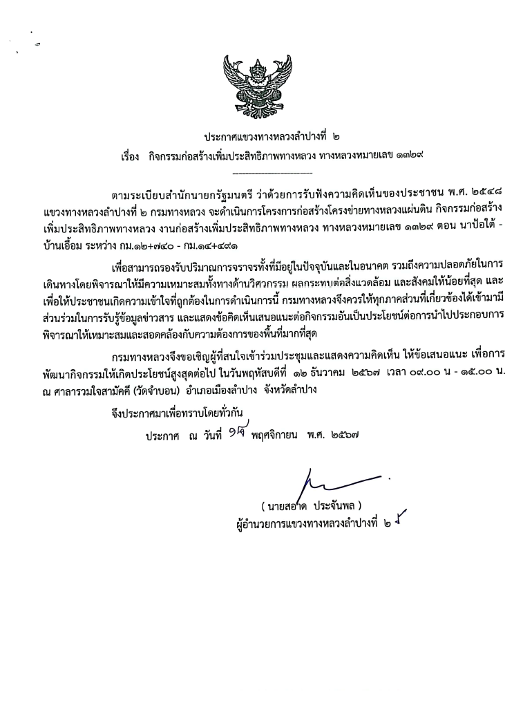 7 02/12/2567 ประกาศแขวงทางหลวงลำปางที่ 2 เรื่องการประชุมการมีส่วนร่วมของประชาชน แผนการดำเนินงานการมีส่วนร่วมของประชาชน โครงการก่อสร้างโครงข่ายทางหลวงแผ่นดิน กิจกรรมก่อสร้าง เพิ่มประสิทธิภาพทางหลวง งานก่อสร้างเพิ่มประสิทธิภาพทางหลวง ทางหลวงหมายเลข ๑๓๒๙ ตอน นาป้อใต้ - บ้านเอื้อม ระหว่าง กม.๑๒+๗๔0 - กม.๑๔+๔๙๑