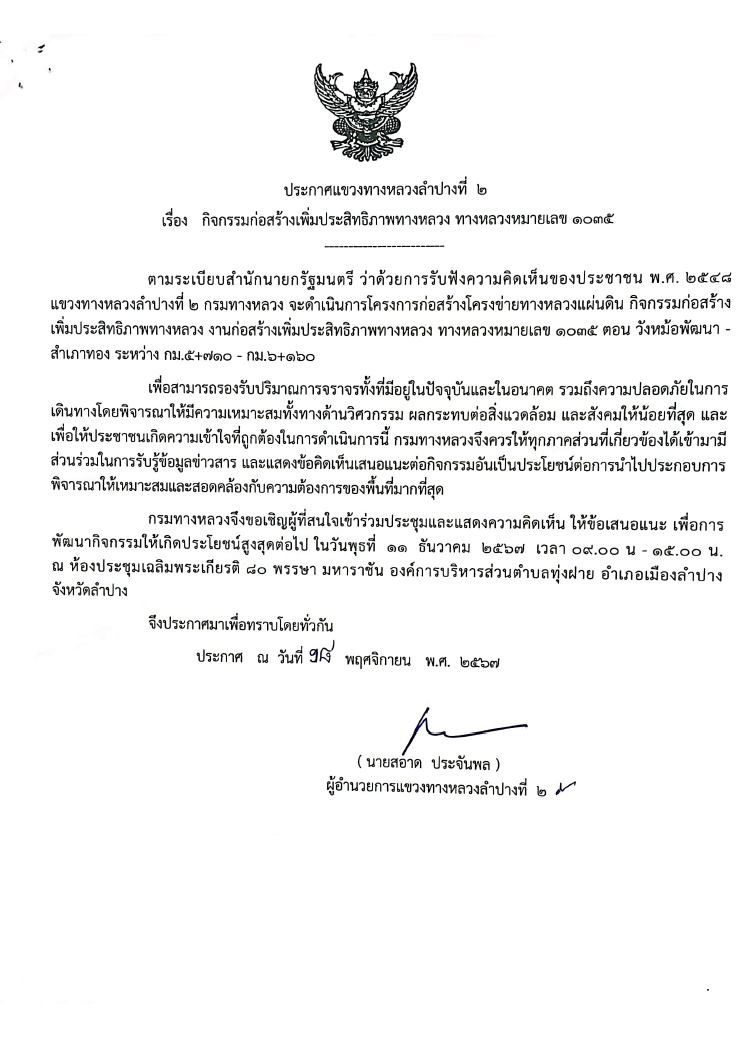 6 02/12/2567 ประกาศแขวงทางหลวงลำปางที่ 2 เรื่องการประชุมการมีส่วนร่วมของประชาชน แผนการดำเนินงานการมีส่วนร่วมของประชาชน โครงการก่อสร้างโครงข่ายทางหลวงแผ่มดิน กิจกรรมก่อสร้างเพิ่มประสิทธิภาพทางหลวง งานก่อสร้างเพิ่มประสิทธิภาพทางหลวง ทางหลวงหมายเลข ๑๐๓๕ ตอน วังหม้อพัฒนา - สำเภาทอง ระหว่าง กม.๕+๗๑๐ - กม.๖+๑๖๐