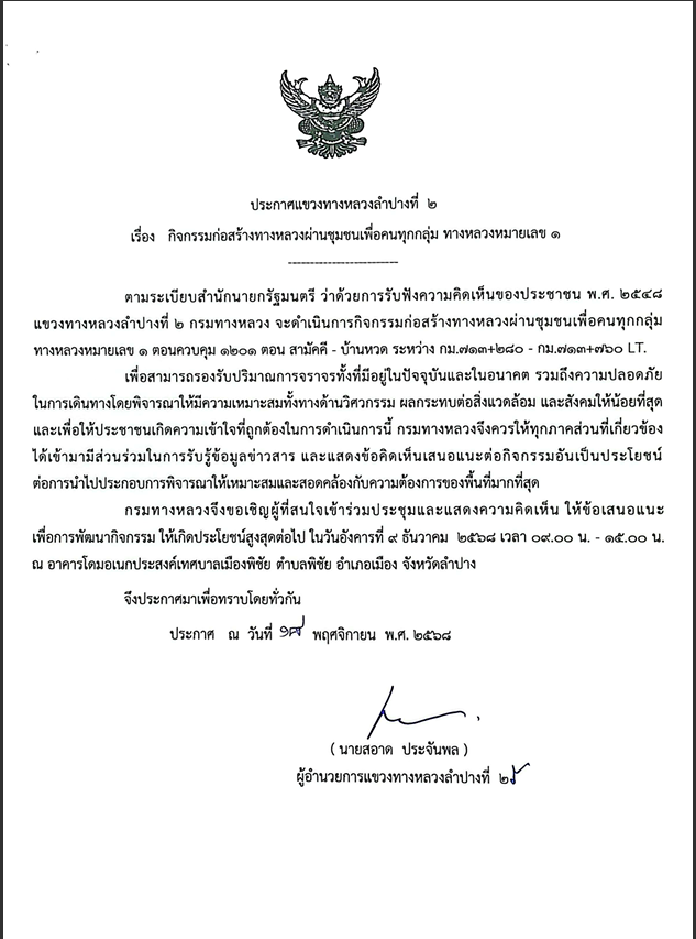 5 26/11/2568 ประกาศแขวงทางหลวงลำปางที่ 2 เรื่องการประชุมการมีส่วนร่วมของประชาชนแผนการดำเนินงานการมีส่วนร่วมของประชาชน กิจกรรมก่อสร้างทางหลวงผ่านชุมชนเพื่อคนทุกกลุ่ม งานก่อสร้างทางหลวงผ่านชุมชนเพื่อคนทุกกลุ่มทางหลวงหมายเลข 1 ตอนควบคุม 1201 ตอน สามัคคี - บ้านหวด ระหว่าง กม.713+280 - กม.713+760 LT.