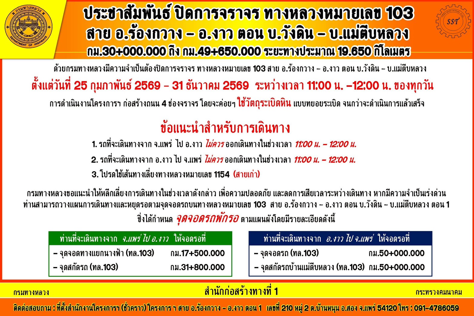 1 25/02/2569 ขอแจ้งปิดการจราจร ทางหลวงหมายเลข 103 สาย อ.ร้องกวาง - อ.งาว ตอน บ.วังดิน - บ.แม่ตีบหลวง จุดที่ 2
