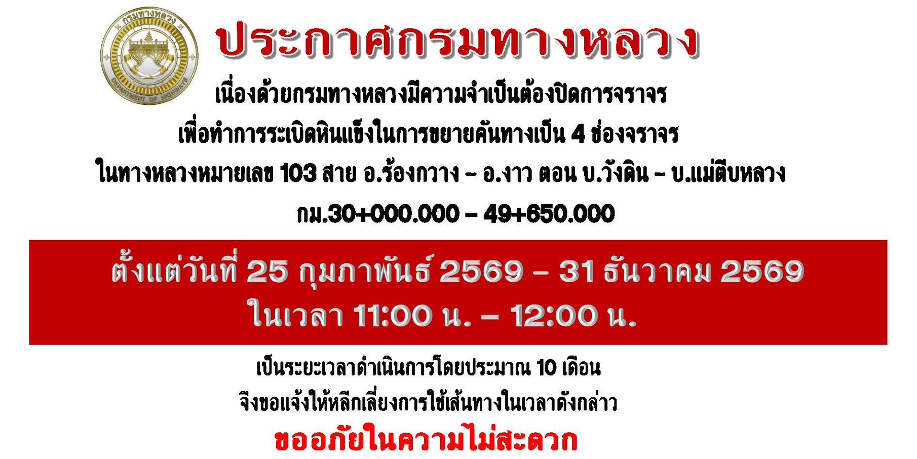 ประชาสัมพันธ์ปิดการจราจร ทางหลวงหมายเลข 103 สาย อ.ร้องกวาง - อ.งาว บ.วังดิน - บ.แม่ตีบหลวง