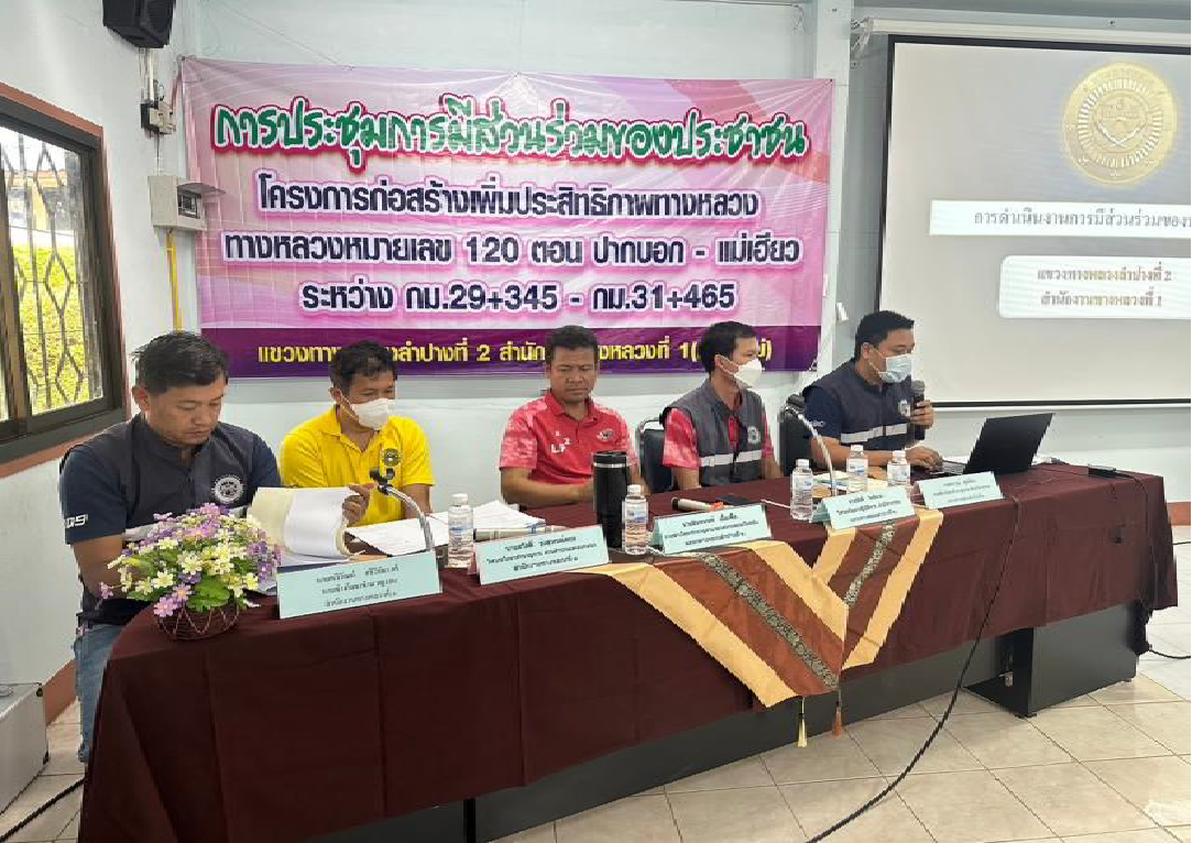 แขวงทางหลวงลำปางที่ 2 ได้ดำเนินการจัดการมีส่วนร่วมของประชาชน ปีงบประมาณ 2567 โครงการกิจกรรมก่อสร้างเพิ่มประสิทธิภาพทางหลวง ทางหลวงหมายเลข 120 ตอนควบคุม 0200 ตอน ปากบอก - แม่เฮียว ระหว่าง กม.29+345 - กม.31+465 โดยดำเนินการประชุมในวันที่ 23 เมษายน 2567 เวลา 09.00 – 15.00 น. ณ ห้องประชุมองค์การบริหารส่วนตำบล วังทอง อ.วังเหนือ จ.ลำปาง เสร็จเรียบร้อยแล้ว